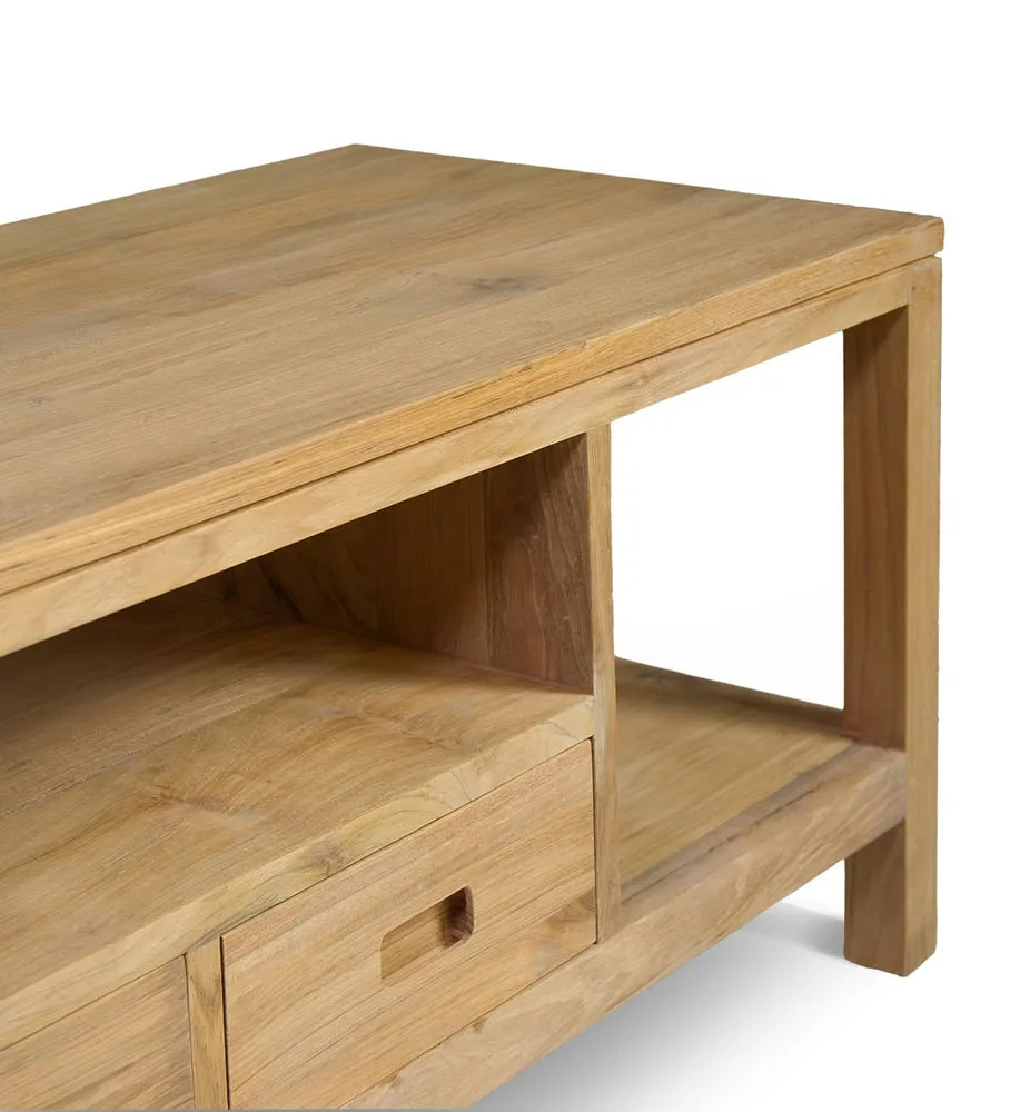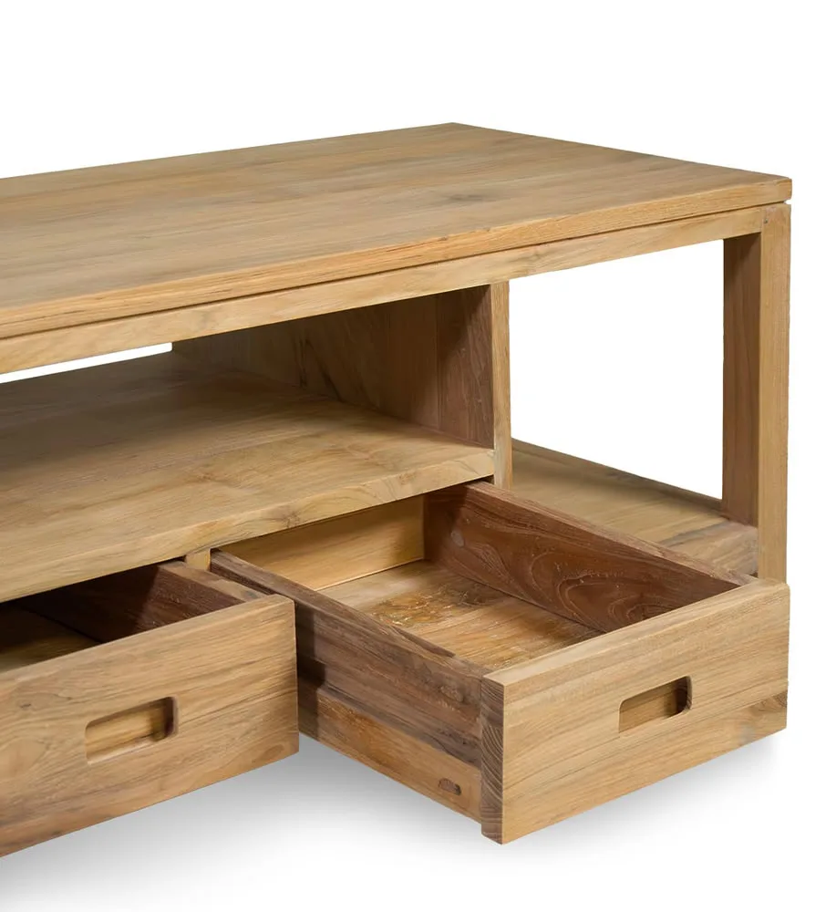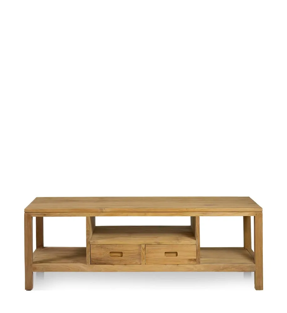 El Mueble TV Teide de teca 2 cajones y 1 hueco 130 x 40 cm combina diseño funcional y estética natural en una pieza compacta y elegante. Fabricado artesanalmente en madera maciza de teca, ofrece espacio de almacenaje gracias a sus dos cajones y un hueco abierto central, ideal para organizar dispositivos multimedia u objetos decorativos. Su diseño limpio y las variaciones propias del trabajo manual hacen de cada mueble una pieza única, perfecta para salones de estilo natural, contemporáneo o mediterráneo.