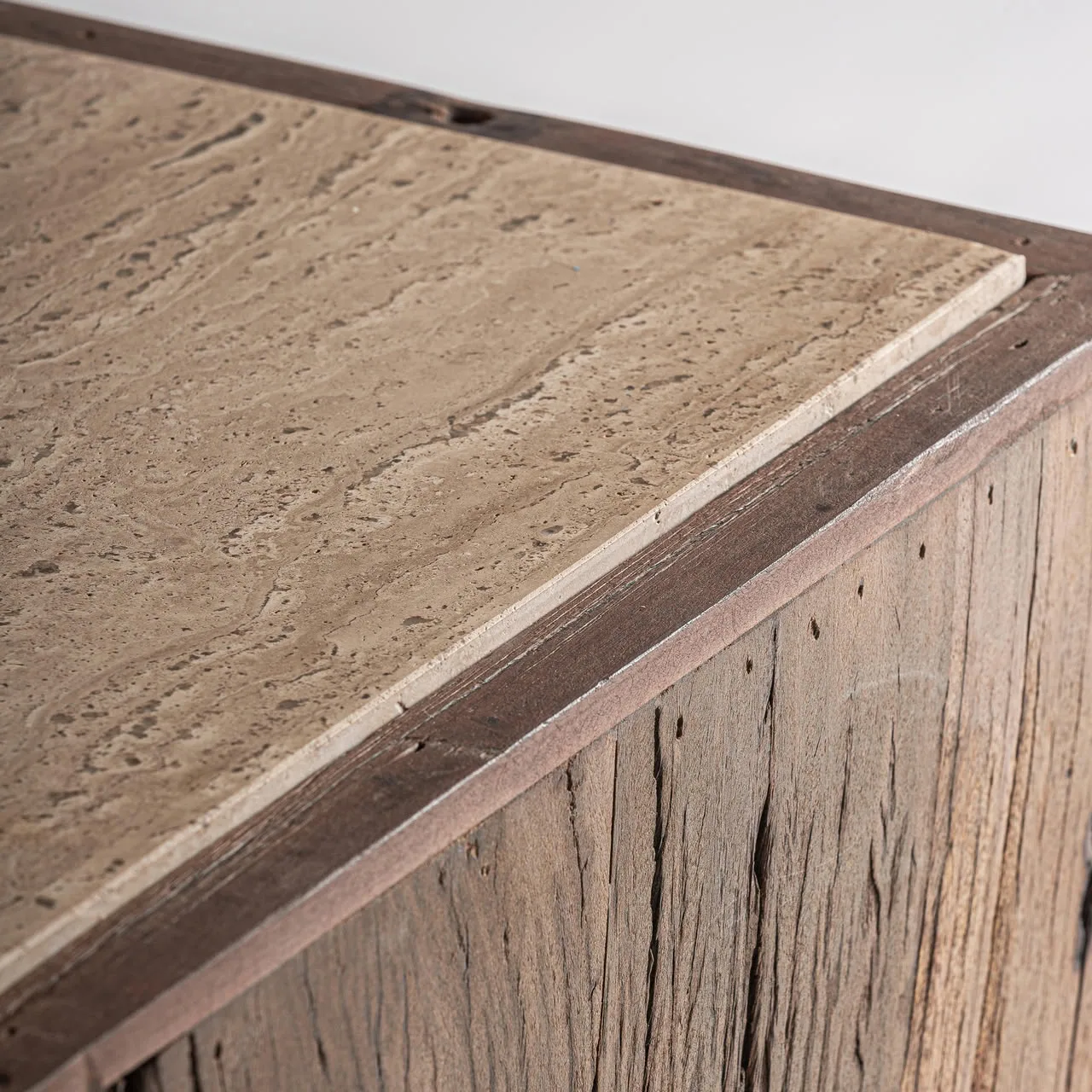 Peana de madera rectangular Merkem de estilo rústico fabricado en madera recuperada en color marrón con acabado envejecido combinado con travertino en color beige con acabado satinado.