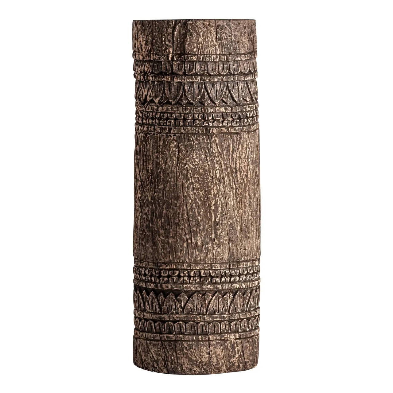 Peana de madera de teca en tono marrón, una pieza única de carácter antiguo que destaca por su presencia escultórica y su autenticidad. Su fabricación artesanal y sus proporciones —39 x 39 x 104 cm— la convierten en un elemento ideal para realzar objetos decorativos, aportando profundidad, historia y elegancia al espacio.