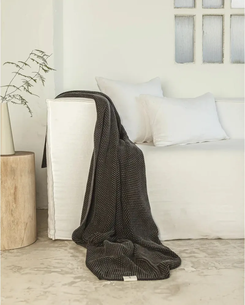 Plaid KARIKAL confeccionado en algodón orgánico 100%, con unas dimensiones de 170 × 130 cm, ideal para aportar calidez y textura a sofás, butacas o camas.