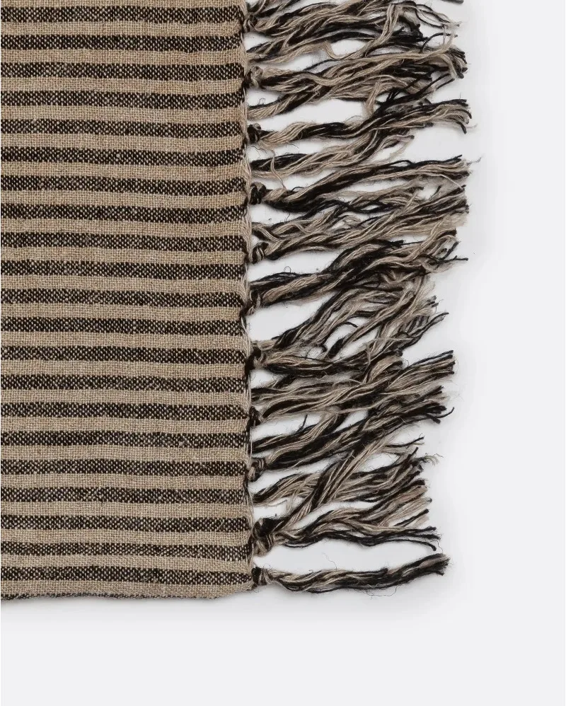 Su diseño de rayas negras sobre fondo natural, rematado con flecos largos, crea una estética elegante y relajada.