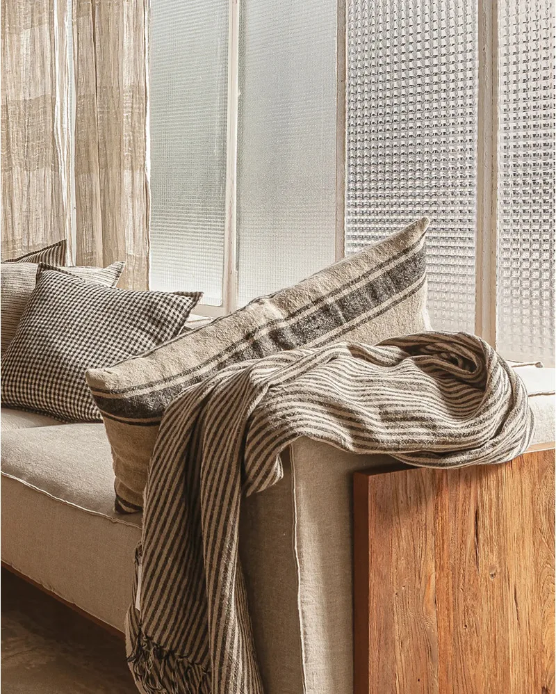 Plaid NOHAR confeccionado artesanalmente en 100% lino lavado a la piedra, con unas dimensiones de 170 × 130 cm, ideal para aportar textura y contraste a sofás, butacas o camas.