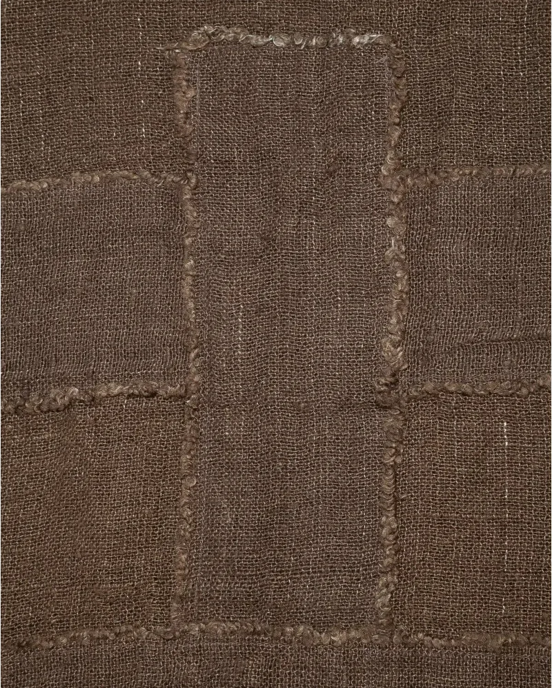 Su diseño en tono natural oscuro con tiras en patchwork crea un efecto visual rico y sofisticado, perfecto para ambientes contemporáneos y naturales.