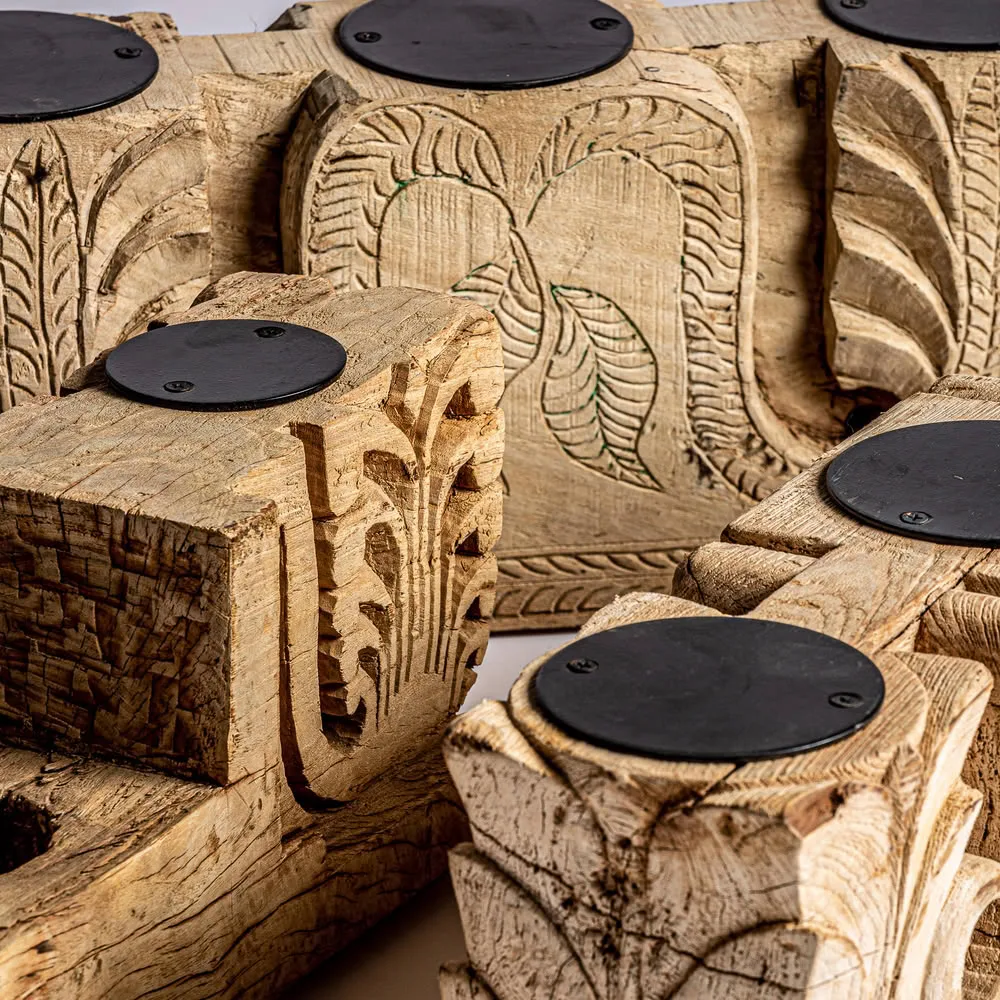 Portavela Argeen de estilo étnico fabricado en madera de teka en color marrón claro con acabado tallado combinado con hierro en color negro.