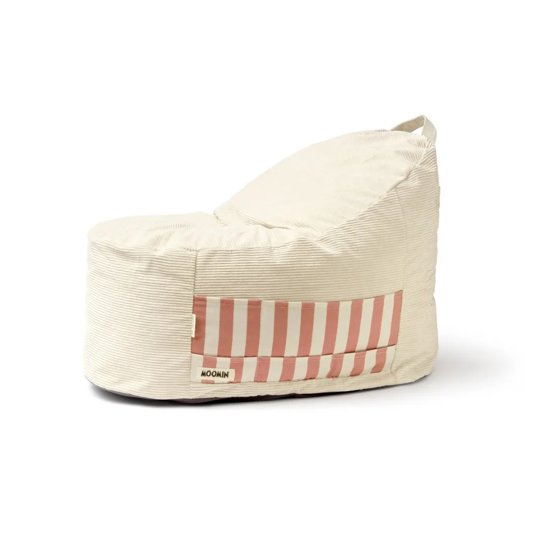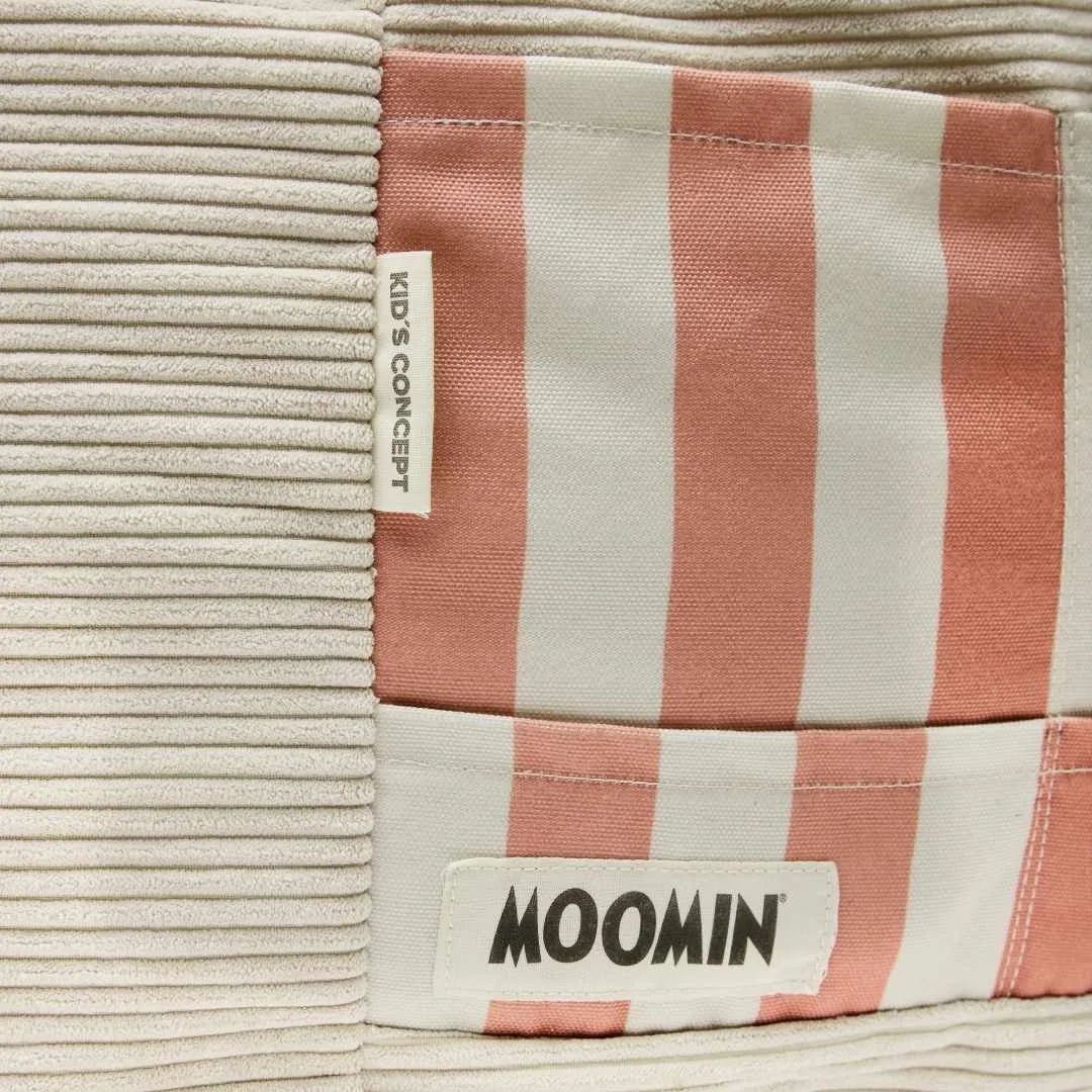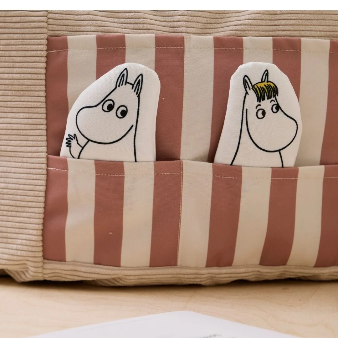 Confeccionado en pana con funda extraíble y lavable a máquina, incorpora un práctico bolsillo lateral donde guardar libros o juguetes, así como tres figuras textiles de los entrañables personajes Moomin: Moominpappa, Snorkmaiden y Moomintroll. Un asiento cómodo, funcional y lleno de ternura que se integra como detalle decorativo en cualquier habitación infantil. Una opción ideal si buscas comprar un puff infantil original y práctico.