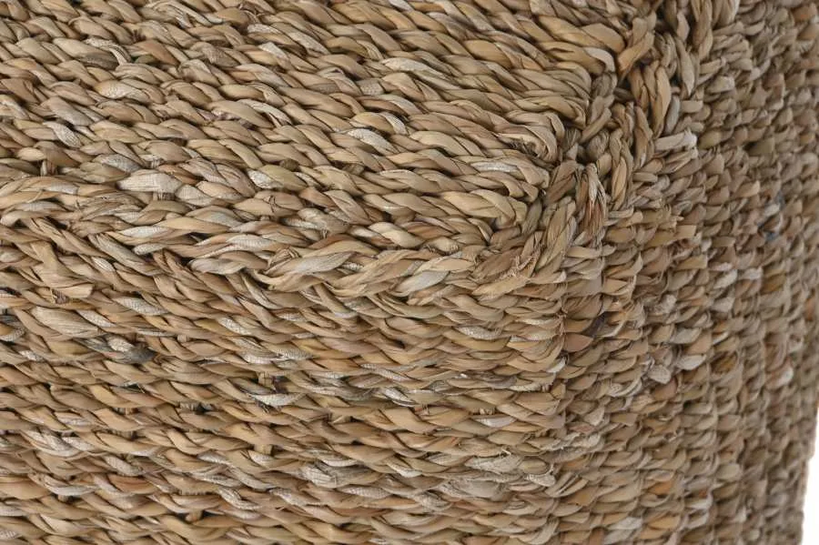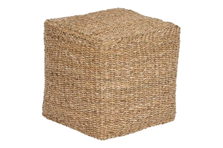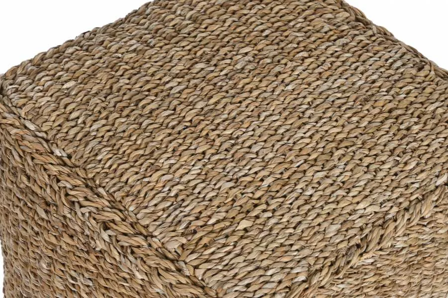 Reposapiés de seagrass y algodón en color natural, con un acabado artesanal y textura orgánica. Su formato cuadrado y compacto lo hace igual de útil como reposapiés, asiento auxiliar o elemento decorativo en salones y dormitorios que buscan un puf de fibra natural con un toque étnico y sostenible.