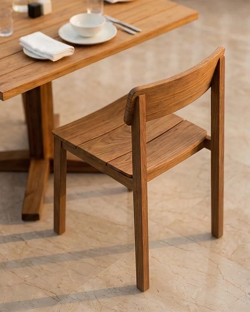 Silla de exterior apilable en madera de teca, una pieza de líneas simples que combina funcionalidad y comodidad. Sus dimensiones —50 x 47 x 78 cm— la hacen ideal para espacios contract y exteriores versátiles.