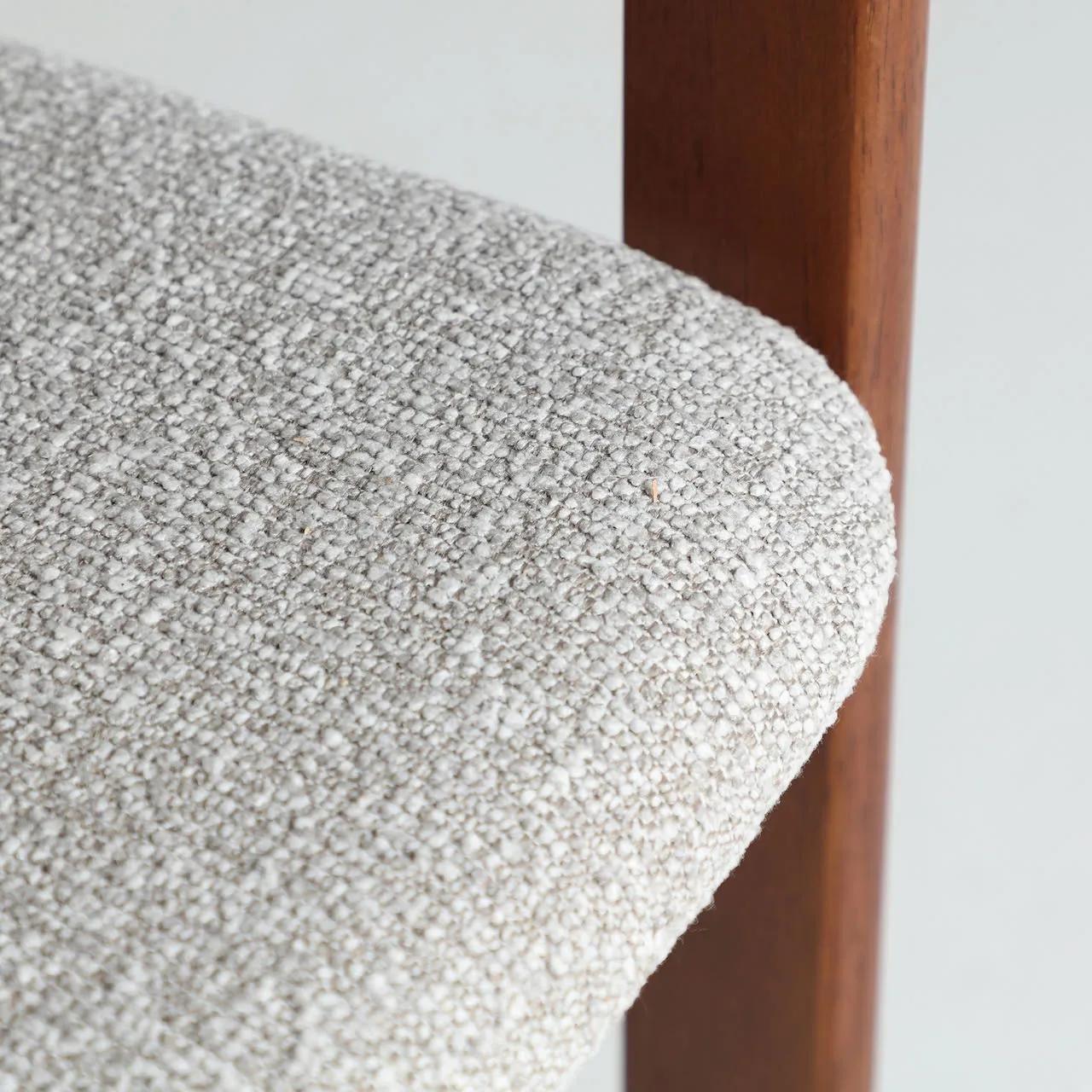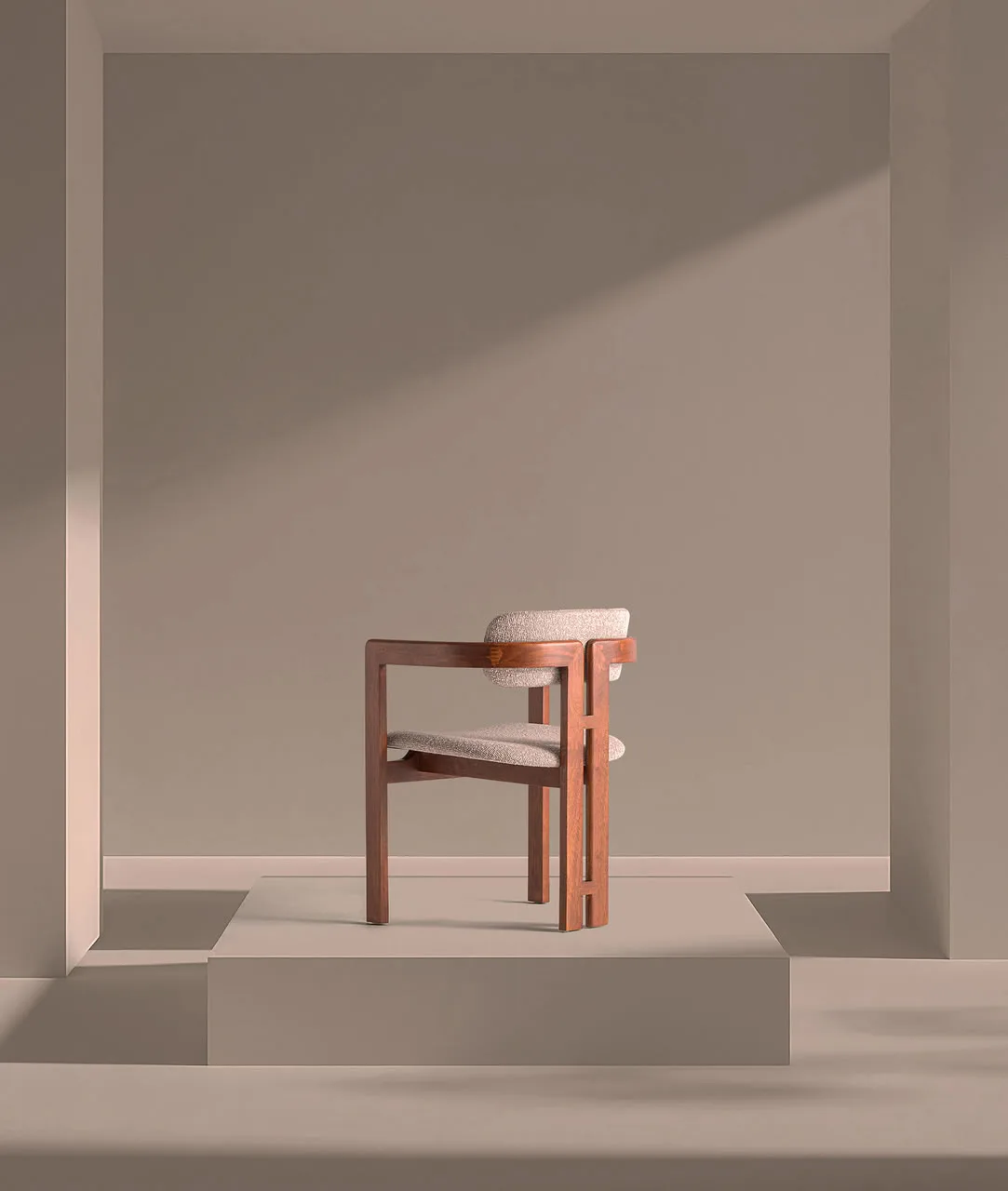 Silla de madera de fresno con asiento y respaldo tapizado en gris, una pieza de diseño arquitectónico que combina estructura y confort. Su estética sofisticada y sus proporciones —57 x 56 x 75 cm— la convierten en una opción ideal para comedores o espacios que buscan elegancia y presencia con un enfoque contemporáneo.