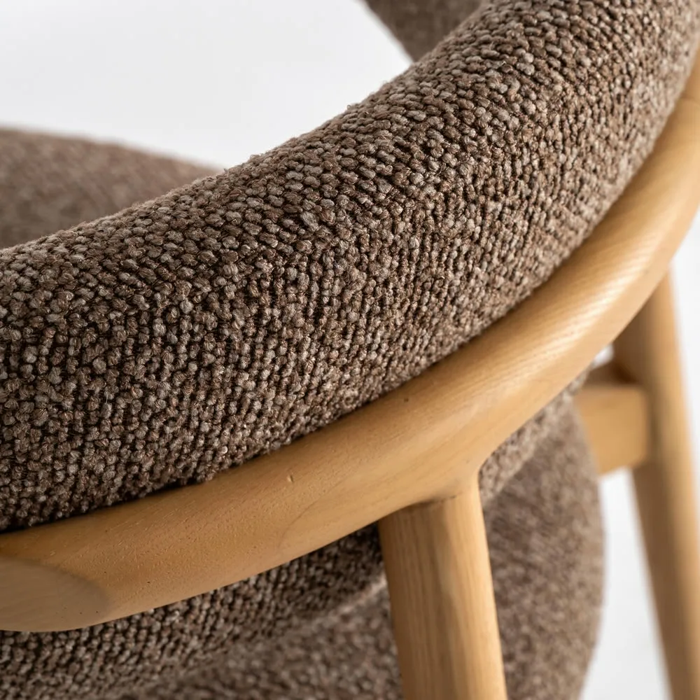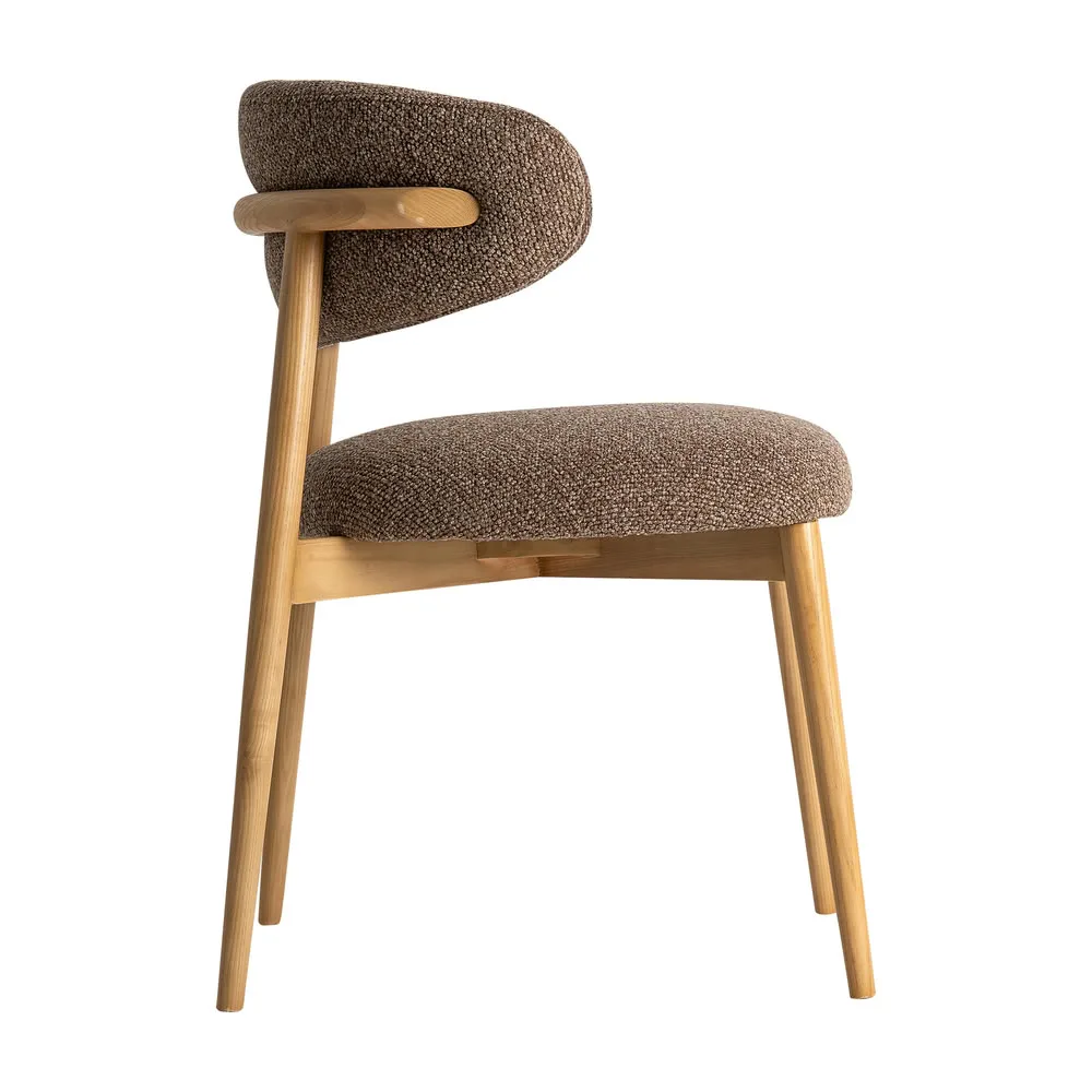 Silla fabricado en poliéster en color topo combinado con madera de arce en color marrón.