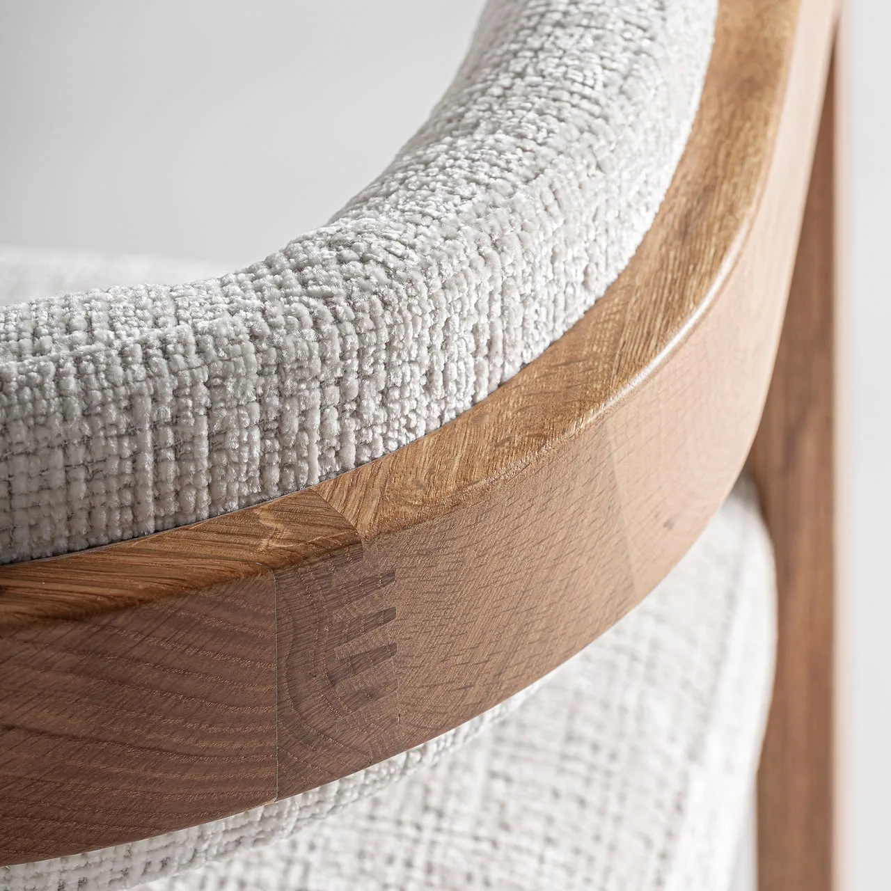 Silla sedzere de estilo colonial, fabricado en madera roble en color marrón, combinado con poliéster en color beige.