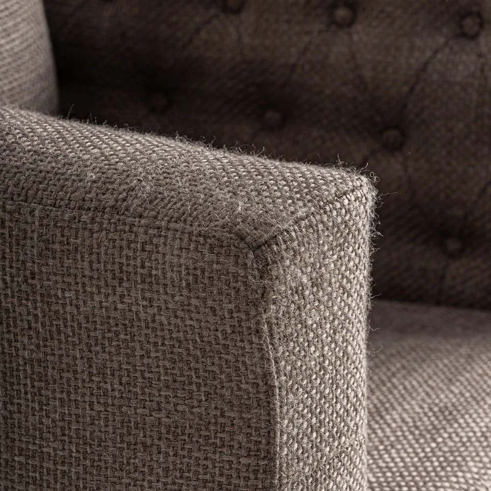 El sillón Carlton combina la suavidad del poliéster jaspeado en tono gris con una sólida estructura de madera de pino en acabado marrón claro. Su estética colonial y su diseño envolvente aportan calidez y equilibrio, creando un asiento acogedor para salones, dormitorios o rincones de lectura.