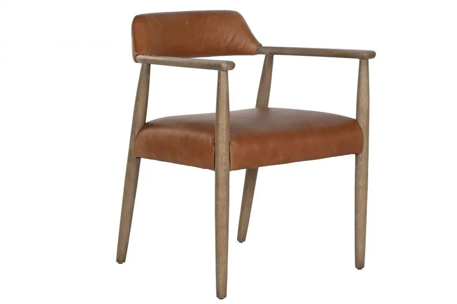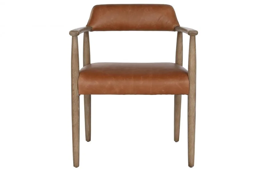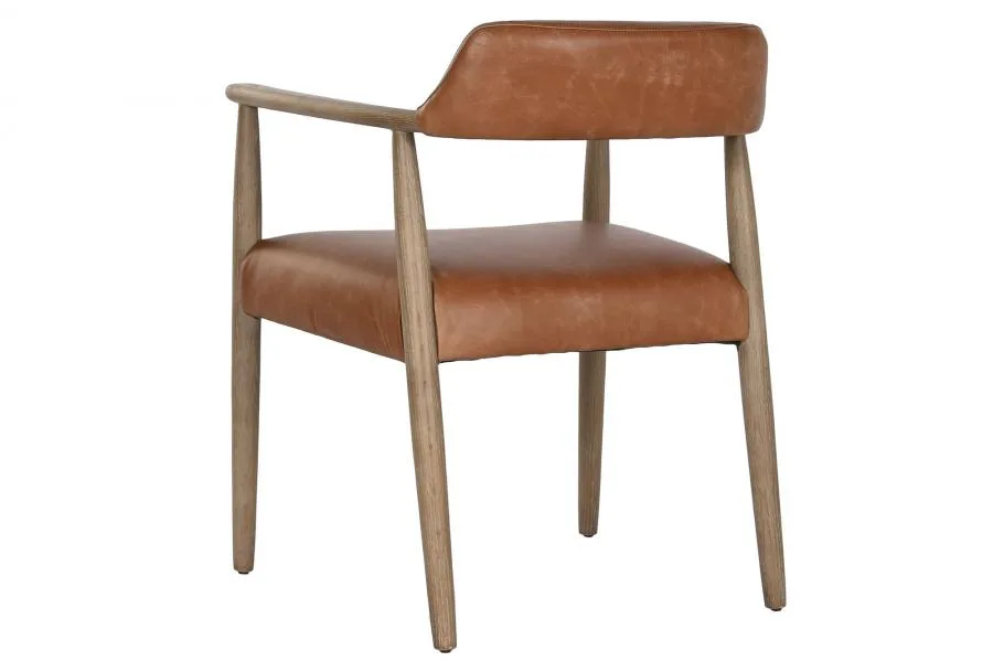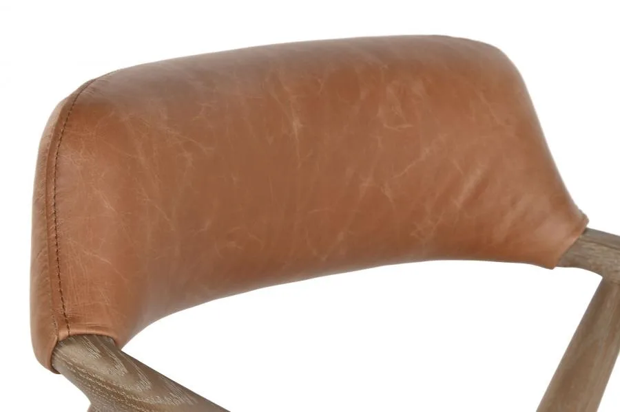 Sillón de madera de fresno con acabado decapé en blanco y tapizado en piel. La combinación de madera decapada y piel natural lo convierte en una pieza especial, perfecta para salones modernos y espacios de hostelería que buscan un sillón tapizado en piel con diseño contemporáneo y elegante.