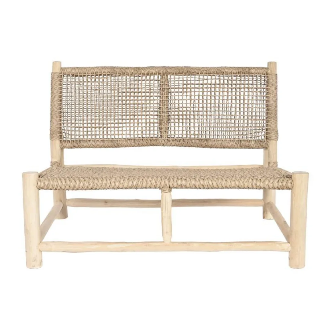 Sillón de madera de teca con asiento y respaldo de fibra natural trenzada, de inspiración balinesa y acabado artesanal. Su generoso formato y su asiento bajo invitan al descanso y la relajación, siendo una pieza perfecta para espacios de exterior protegidos o rincones del hogar que buscan un sillón de teca con fibra natural cómodo, duradero y con un carácter étnico inconfundible.