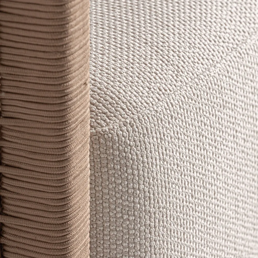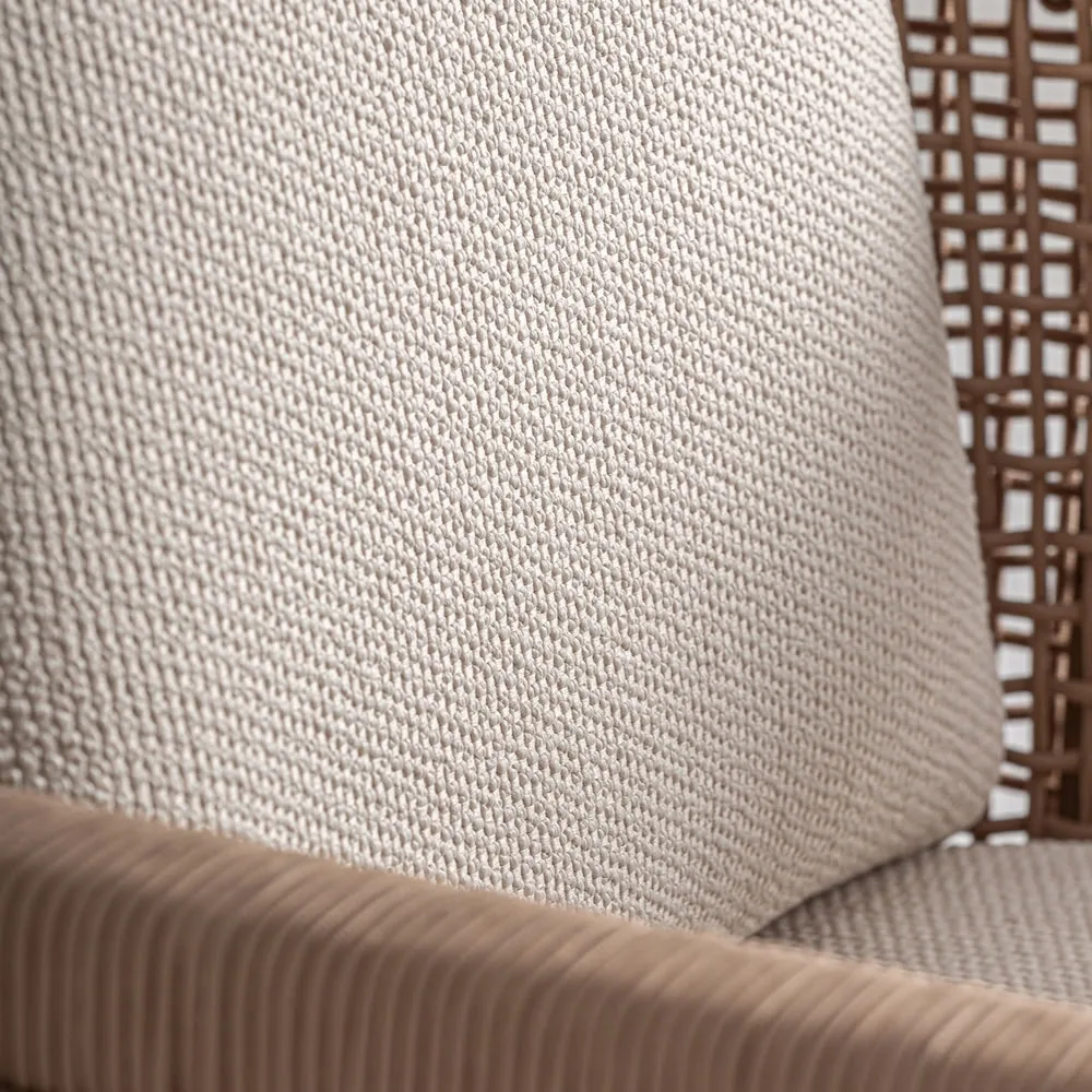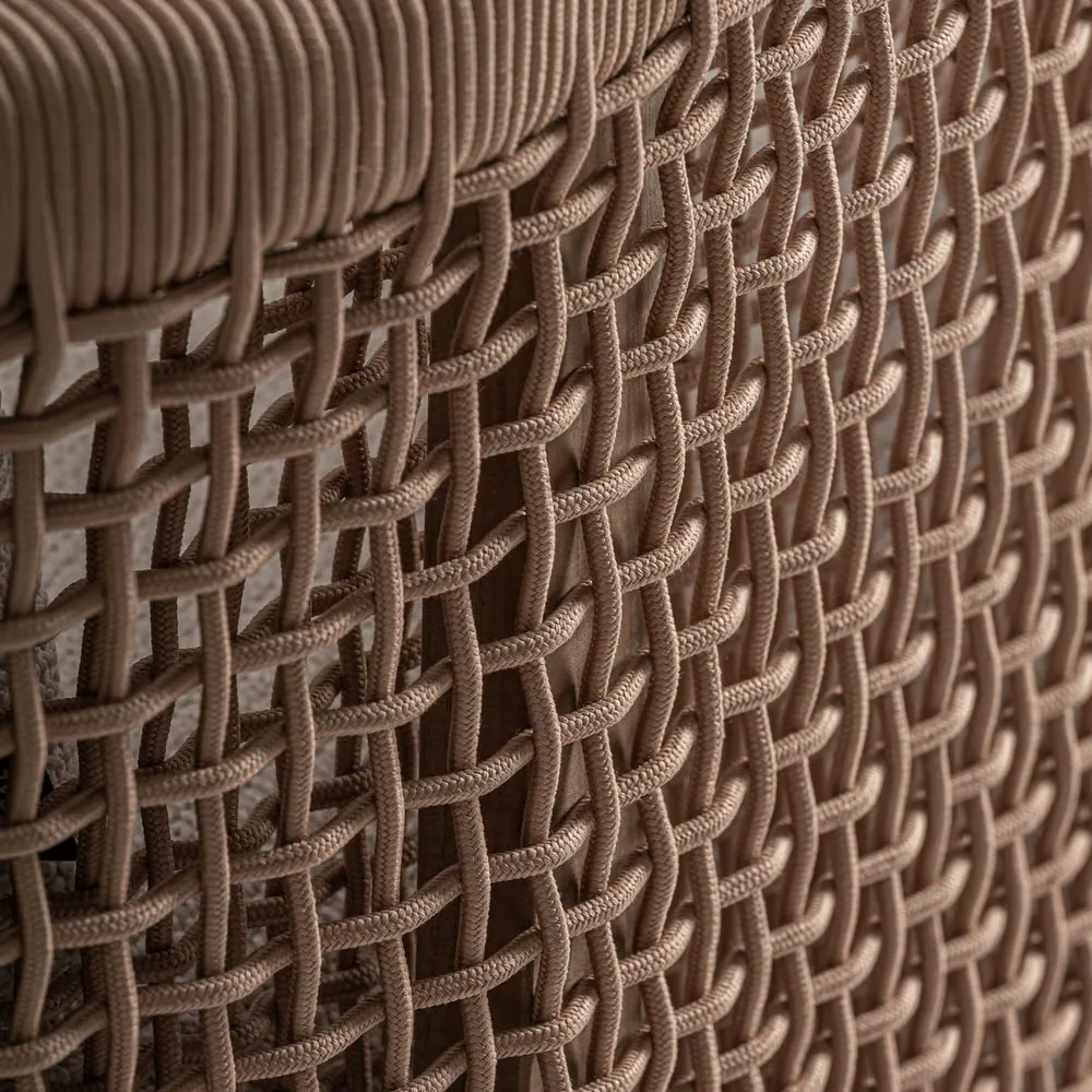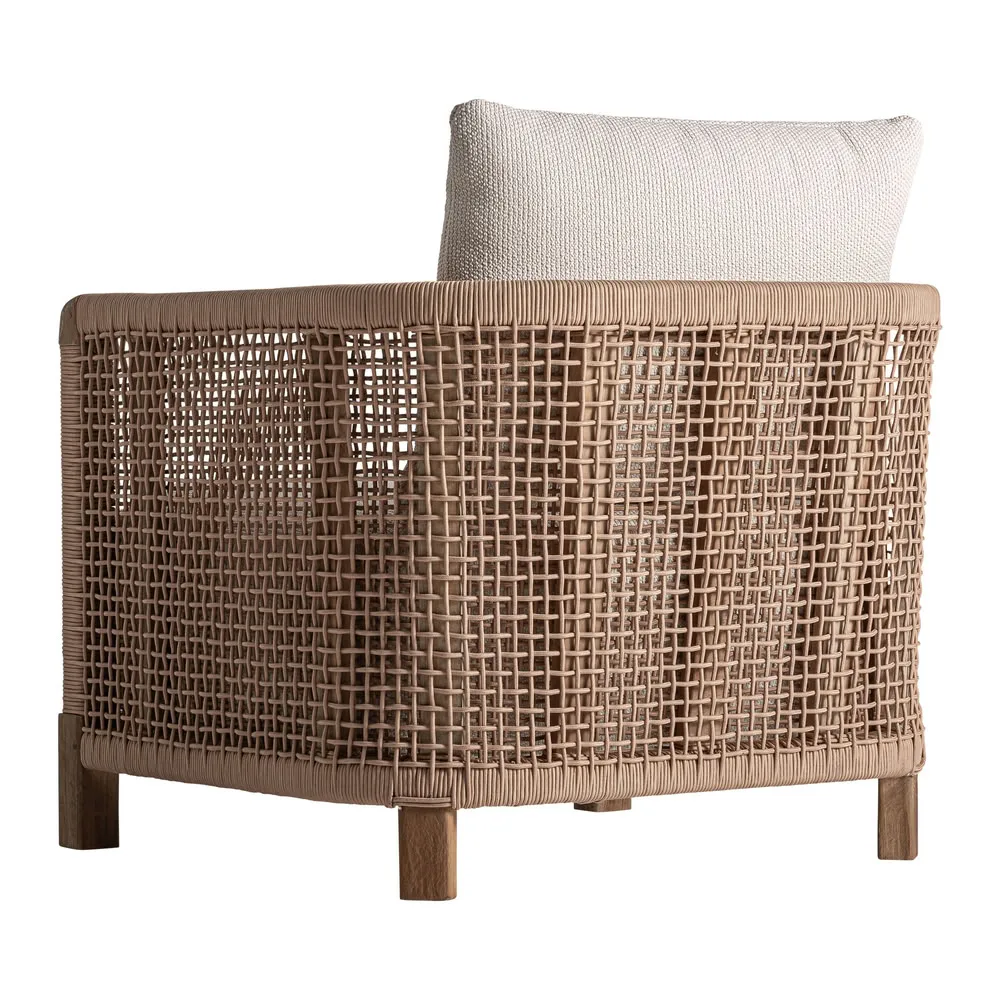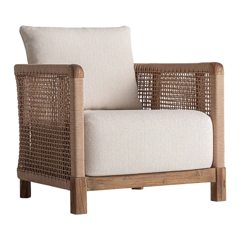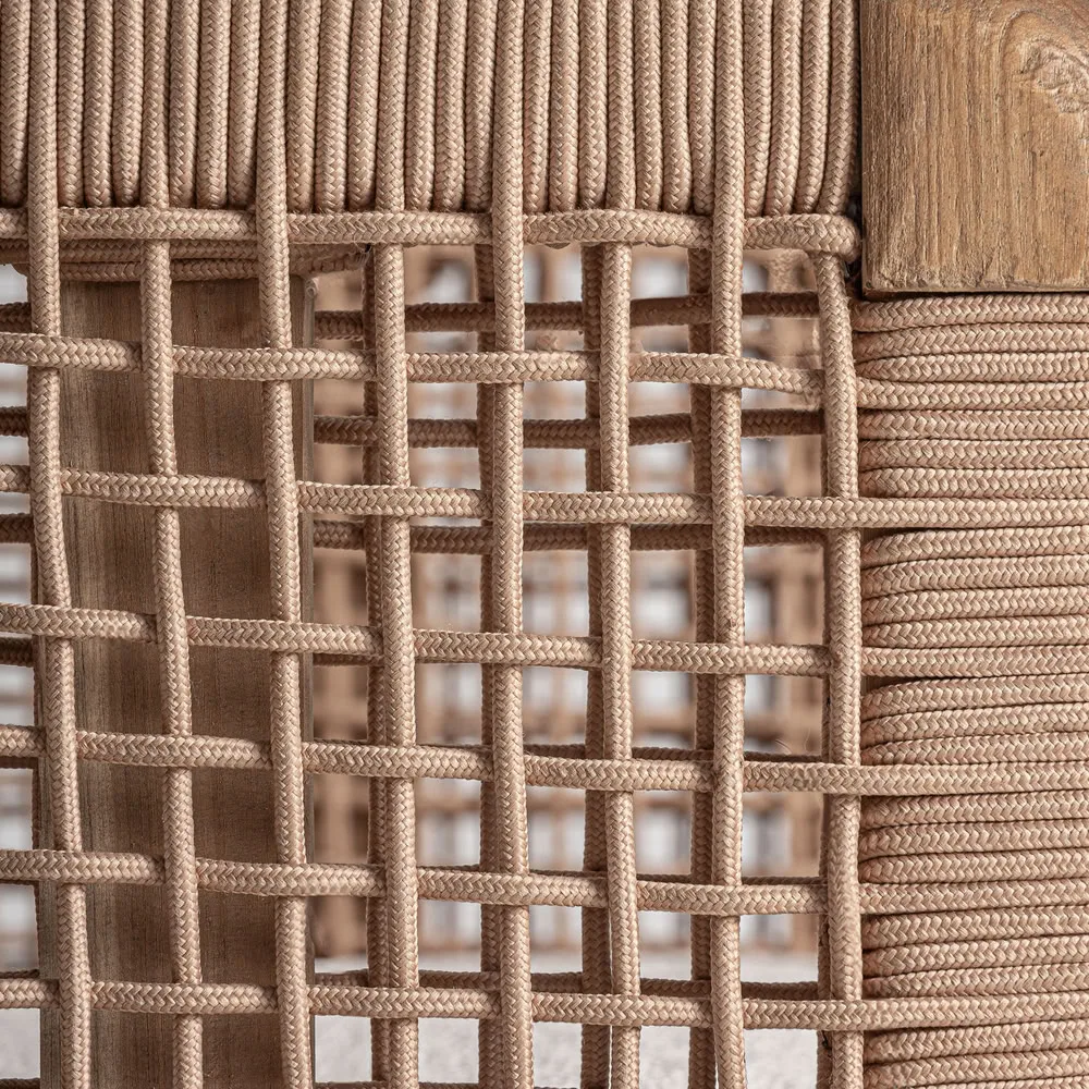 Sillón trena de estilo boho fabricado en madera de teka reciclada en color marrón combinado con polipropileno reciclado en color blanco. Producto desmontable.