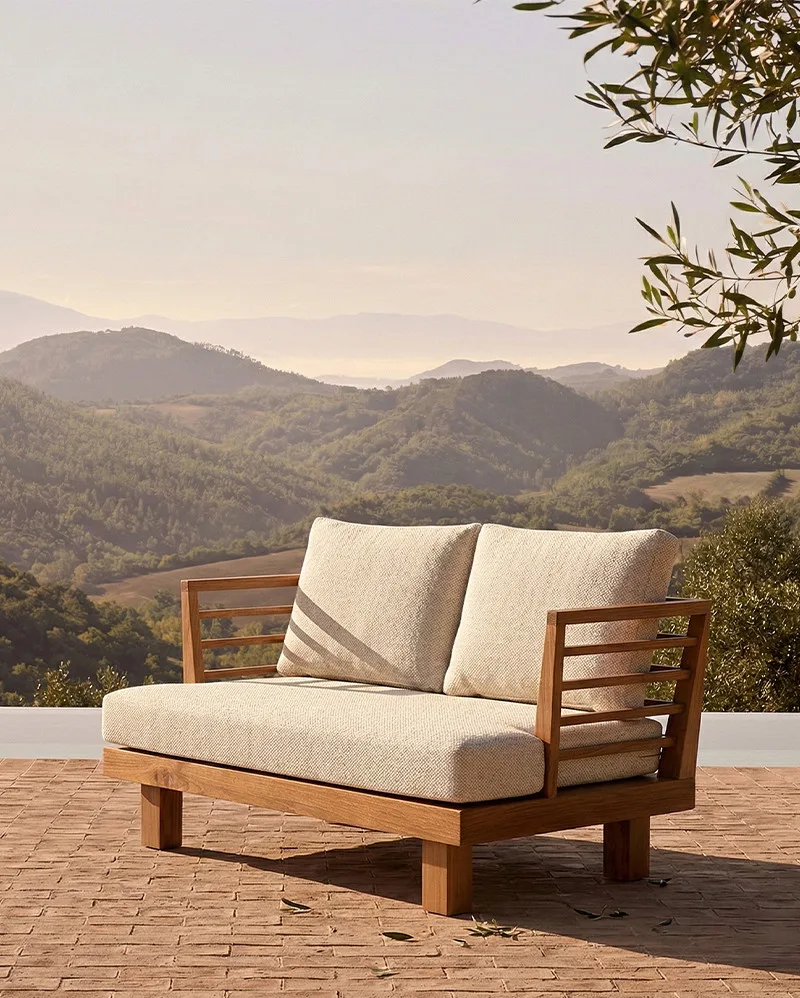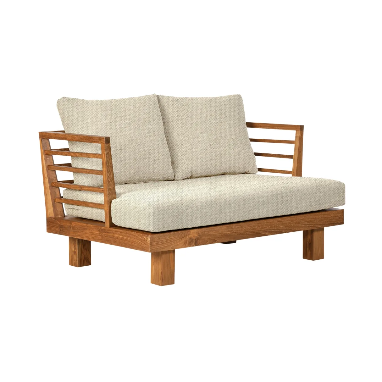 Sofá de exterior de 2 plazas en madera de teca reciclada con tapizado en tono marfil, una pieza de líneas limpias que combina confort y durabilidad. Sus dimensiones —130 x 84 x 67 cm— lo hacen ideal para crear espacios exteriores elegantes y acogedores.