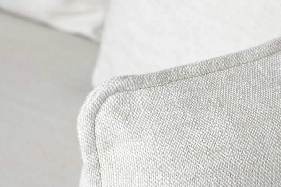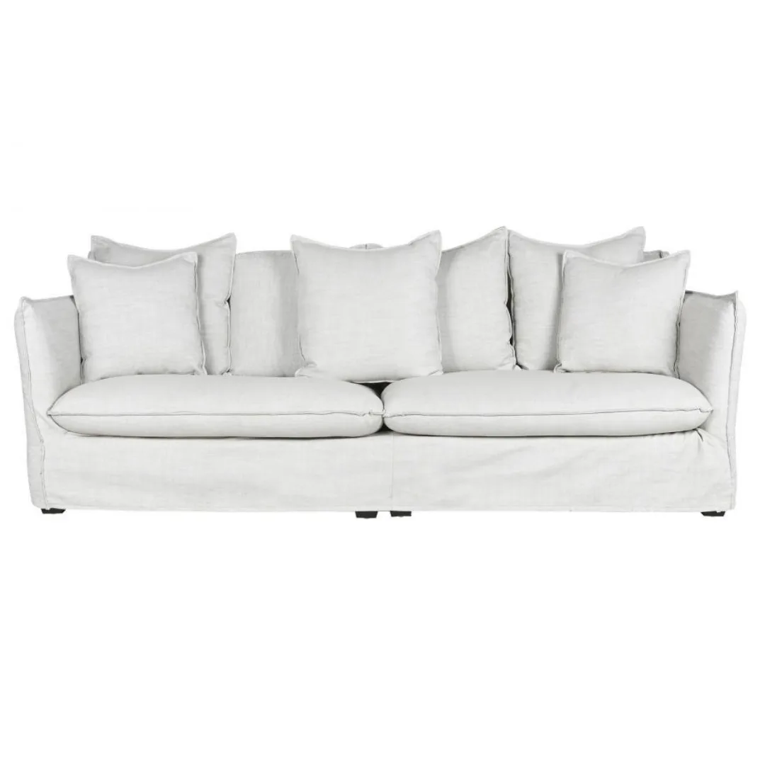 Sofá de 3/4 plazas tapizado en lino con funda desenfundable y 7 cojines incluidos, relleno de poliéster. Su generosa profundidad y su tapizado en lino de textura natural lo convierten en una pieza acogedora y elegante para salones y espacios de hostelería que buscan un sofá tapizado en lino desenfundable cómodo, duradero y de fácil mantenimiento.