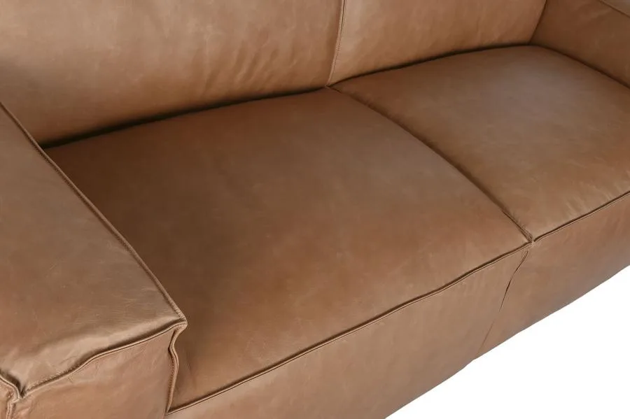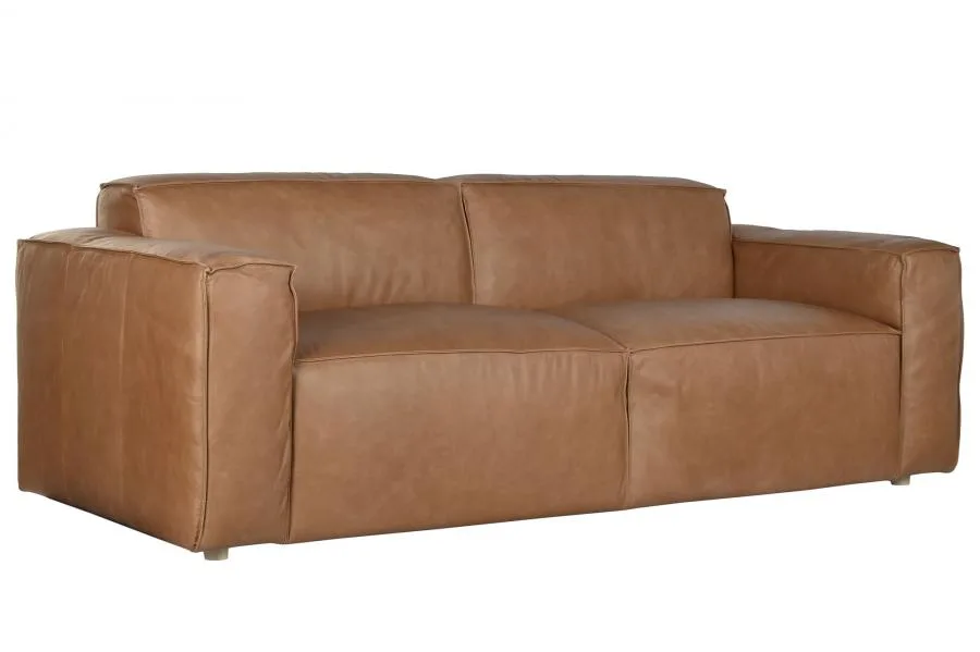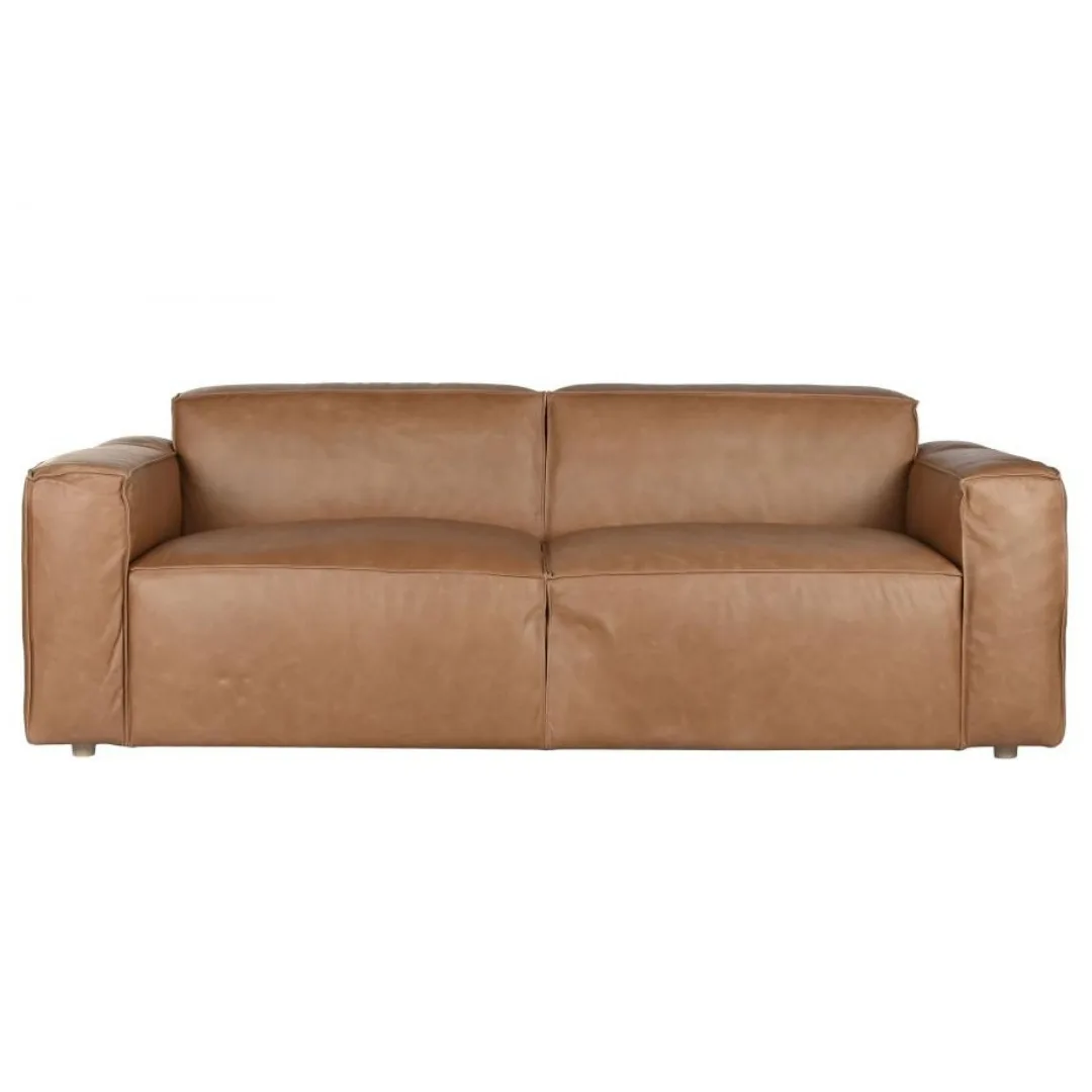 Sofá de tres plazas tapizado en piel color cognac, de estética urbana y sofisticada. Su diseño clásico y atemporal, combinado con la calidad y durabilidad de la piel natural, lo convierte en una pieza central y elegante para salones modernos que buscan un sofá de piel de tres plazas de calidad y larga vida útil.