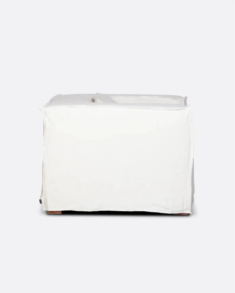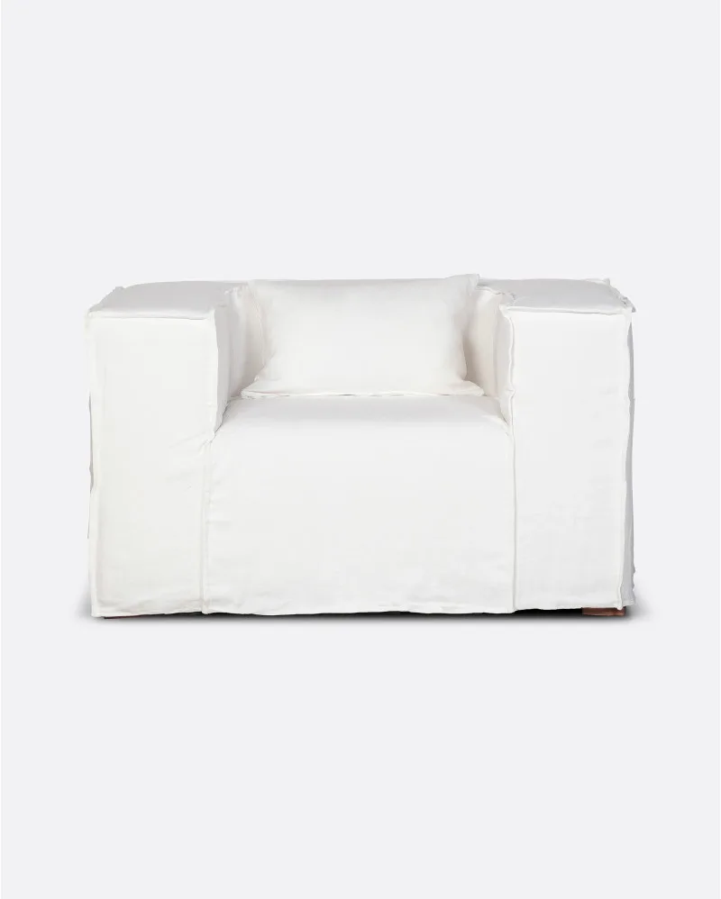 Sofá STROZZI de 1 plaza, fabricado con estructura de madera y funda de lino blanco, con unas dimensiones de 120 × 95 × 65 cm, perfecto para crear un rincón de descanso elegante y luminoso.