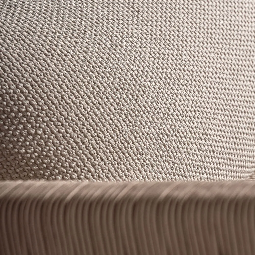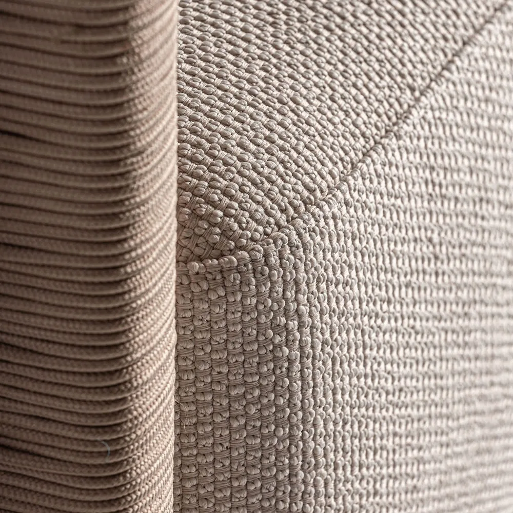Sofá trena de estilo boho fabricado en madera de teka reciclada en color marrón con acabado natural combinado con polipropileno reciclado en color beige y espuma. Producto desmontable desenfundable.