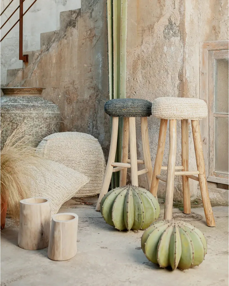 El taburete alto de teca y alga ALGA de 75 cm de Dareels es una pieza que representa la unión entre naturaleza, tradición y diseño funcional. Su asiento está elaborado con alga marina trenzada, una fibra sostenible, resistente y 100% biodegradable que aporta textura, confort y autenticidad al conjunto.