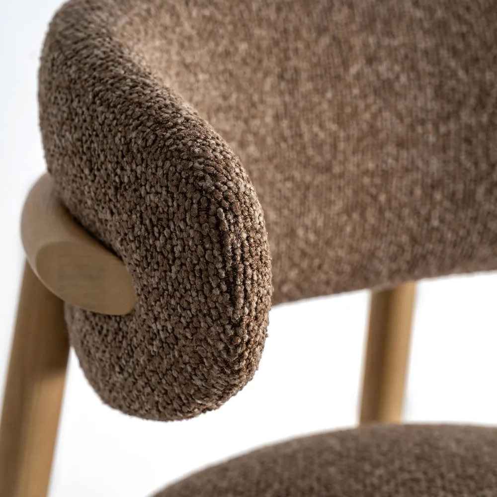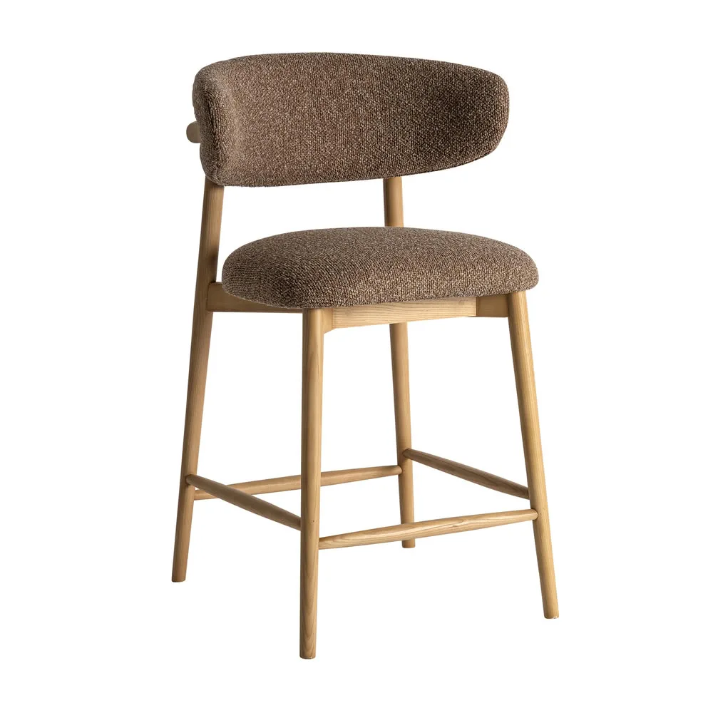 Taburete de diseño contemporáneo, tapizado en poliéster topo y sostenido por una estructura de fresno marrón que aporta estabilidad y calidez. Su respaldo envolvente y su altura lo convierten en una pieza cómoda y elegante para cocinas, barras y espacios modernos.