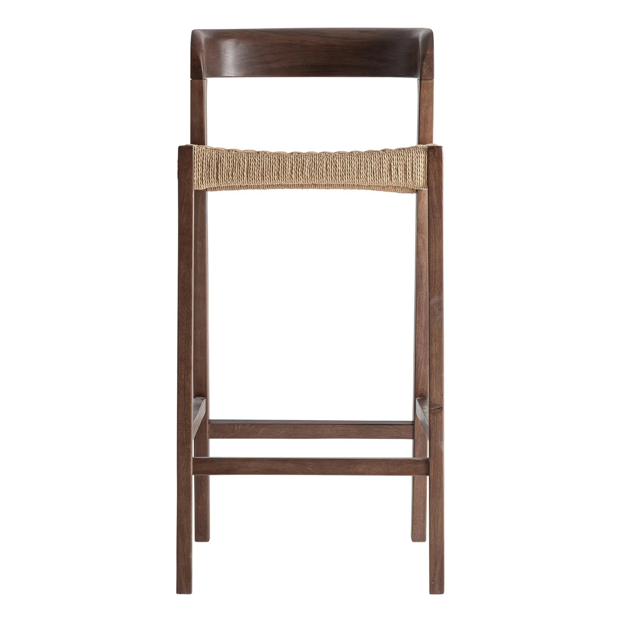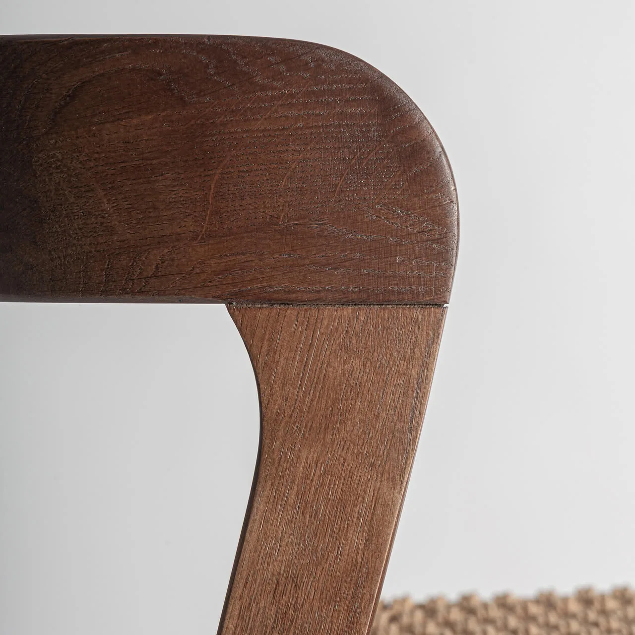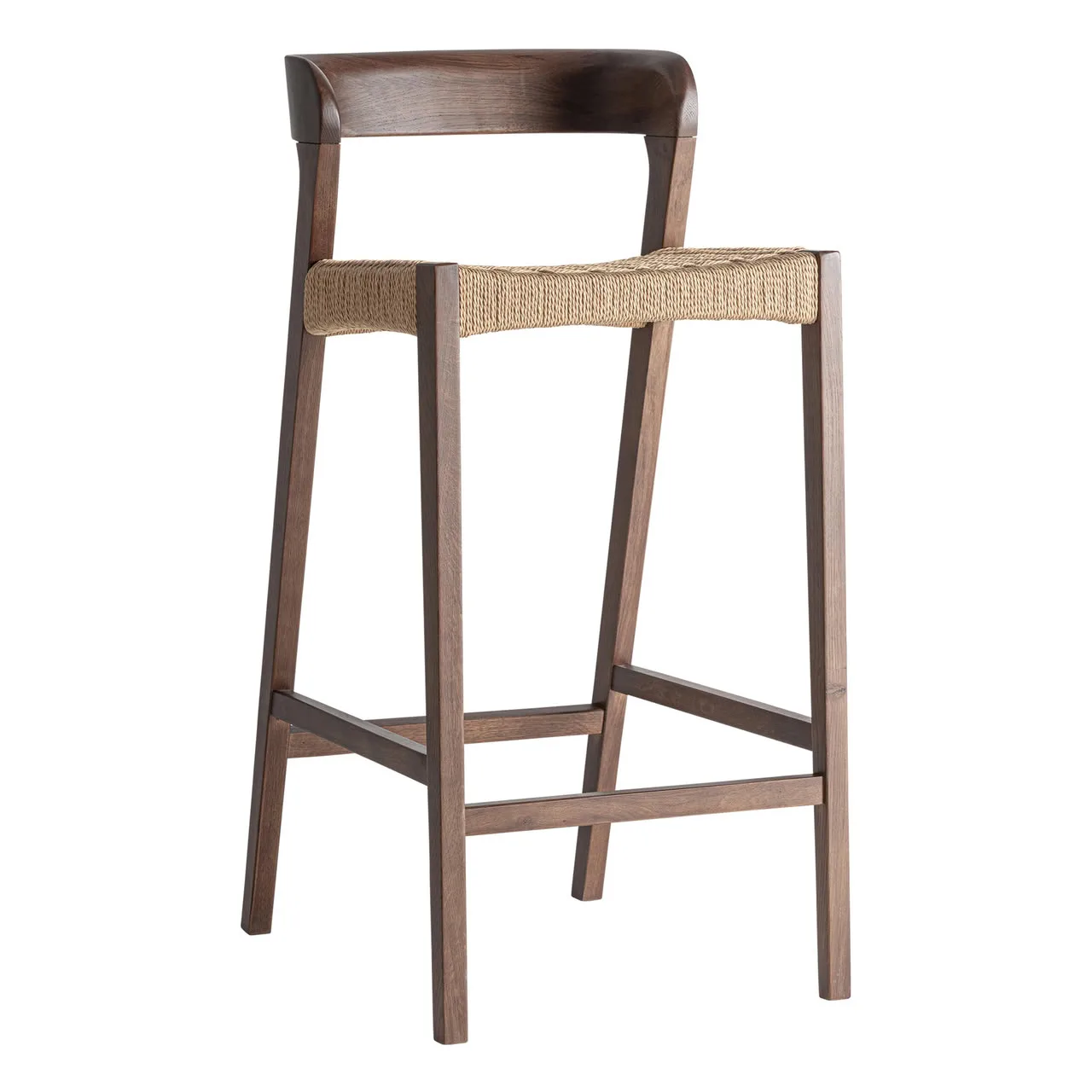 Taburete de roble con asiento de fibra natural en tono marrón claro, una pieza que destaca por su elegancia vertical y su equilibrio entre solidez y ligereza. Su diseño contemporáneo con esencia artesanal y sus proporciones —45 x 53 x 96 cm— lo convierten en una opción ideal para espacios que buscan carácter y sofisticación natural.