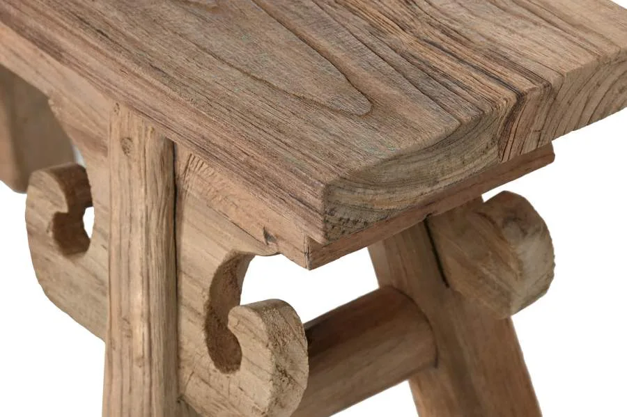 Taburete de teca reciclada en color marrón con tallado artesanal, una pequeña pieza con mucho carácter. Su formato compacto lo hace igual de útil como reposapiés, asiento auxiliar o elemento decorativo en entradas y salones con decoración étnica e indonesia. El tallado artesanal garantiza que cada unidad sea diferente a las demás.