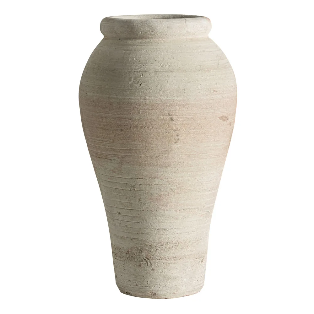 Tinaja de estilo clásico fabricado en arcilla en color blanco roto con acabado envejecido.