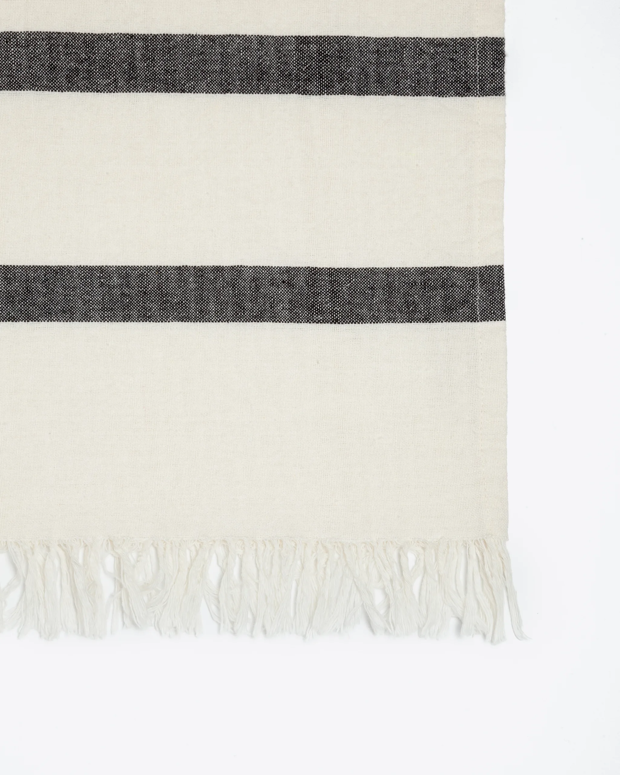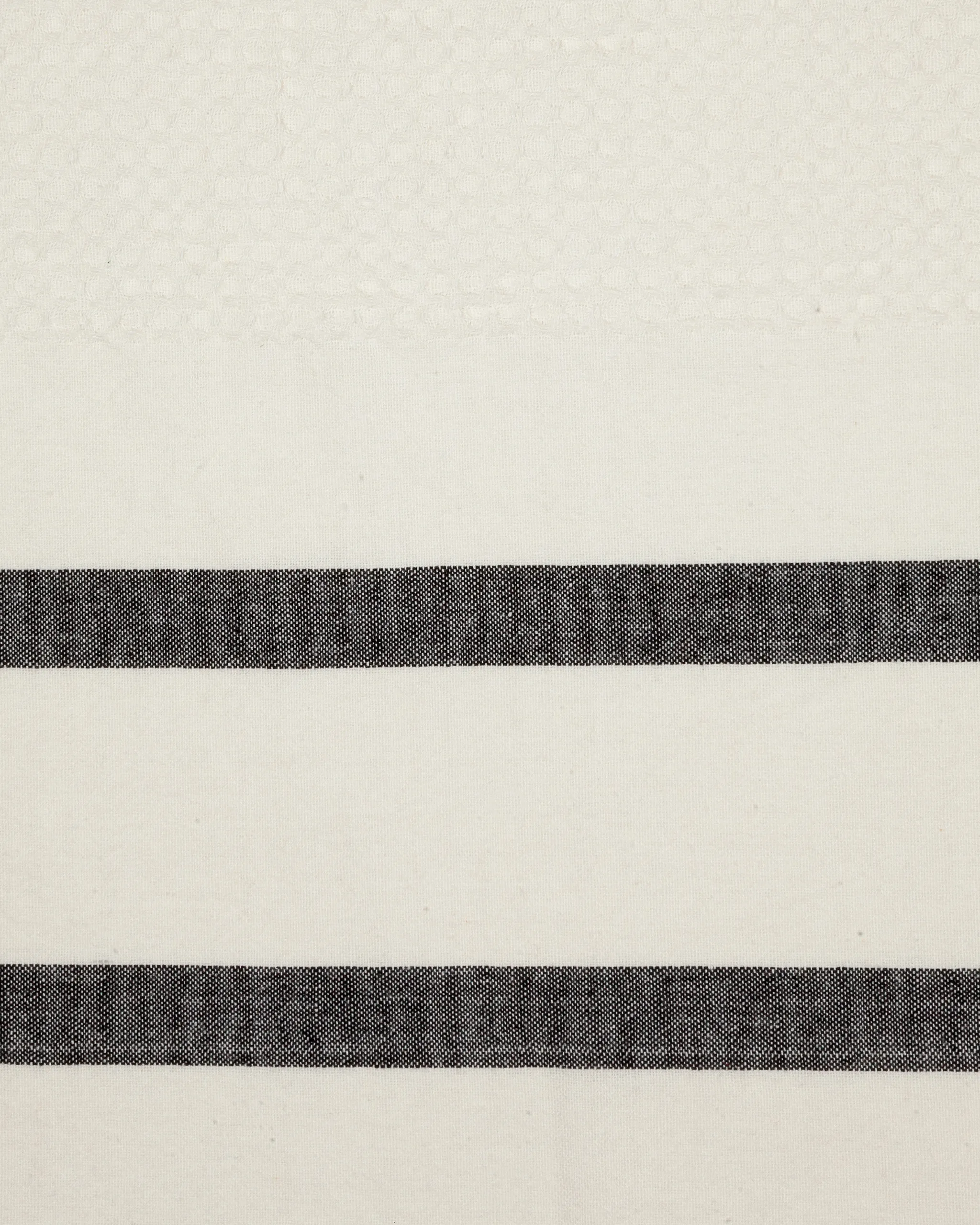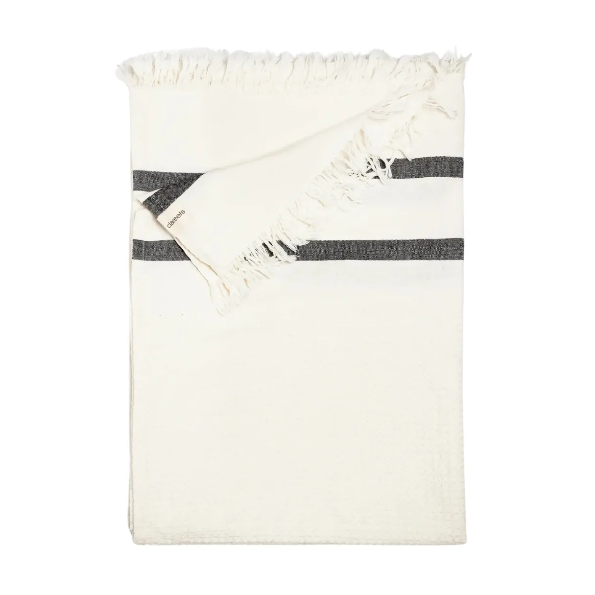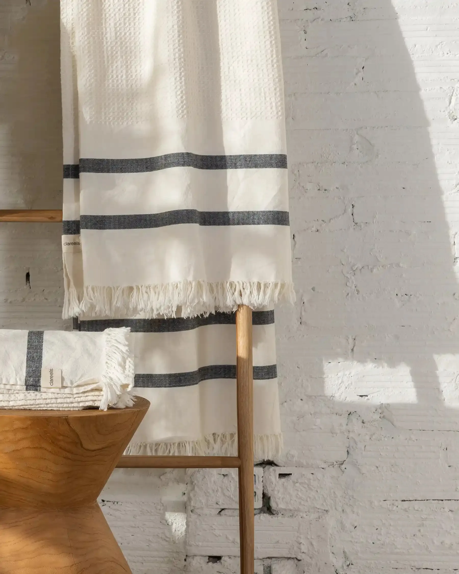La toalla CHENNAI de Dareels está confeccionada en 100% algodón reciclado y presenta un acabado lavado a la piedra que aporta suavidad y carácter. Su tejido artesanal de nido de abeja, junto con su diseño en blanco con franjas en gris marengo, combina funcionalidad y estética, ofreciendo una pieza versátil y agradable al tacto para el día a día.