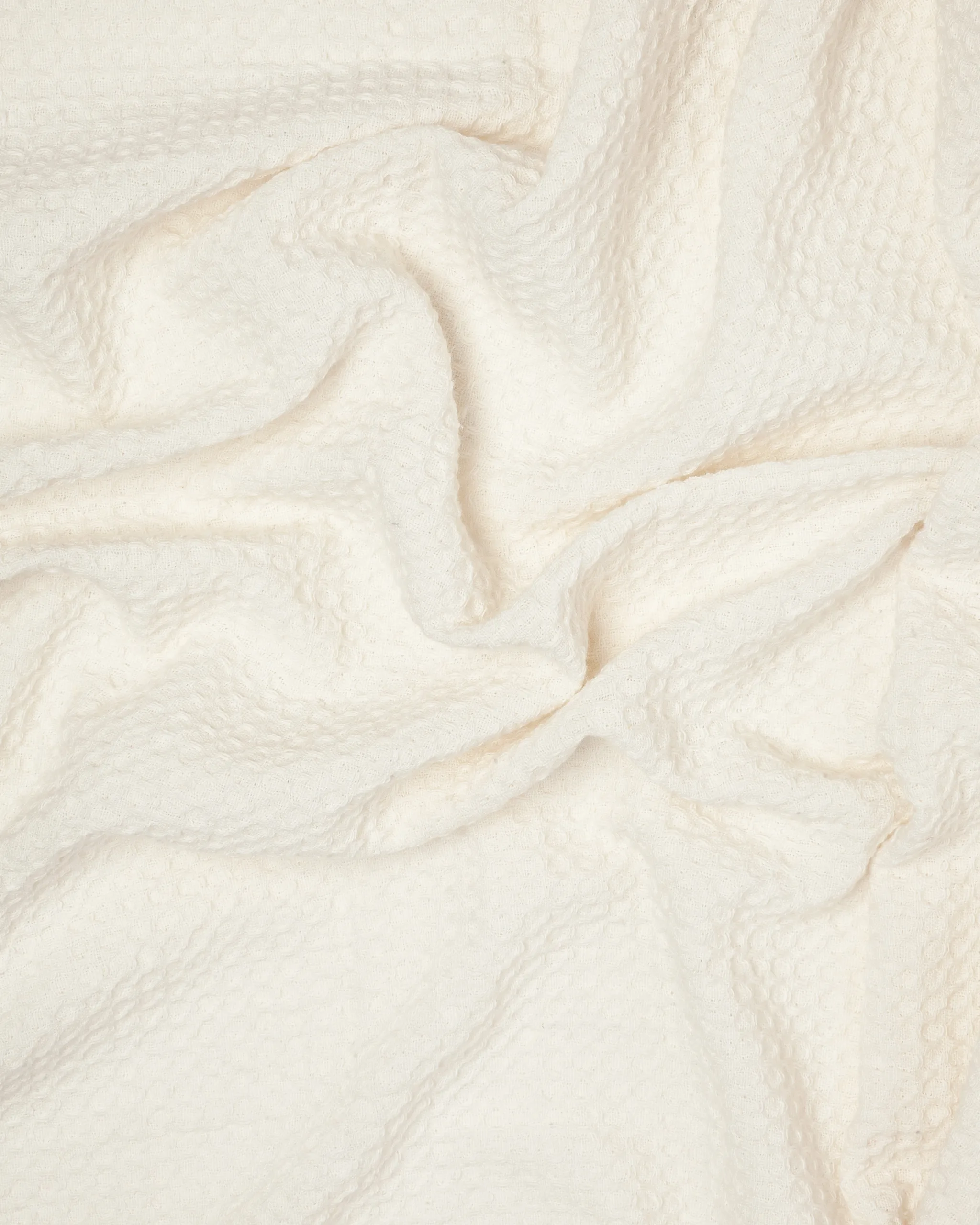 Toalla de algodón reciclado en color blanco con textura nido de abeja, una pieza ligera y absorbente que combina funcionalidad y estética artesanal. Sus dimensiones —200 x 100 cm— la hacen ideal para el uso diario con un toque natural.