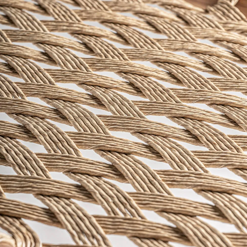 Tumbona belley de estilo boho fabricado en madera de teka en color marrón combinado con cuerda en color marrón.