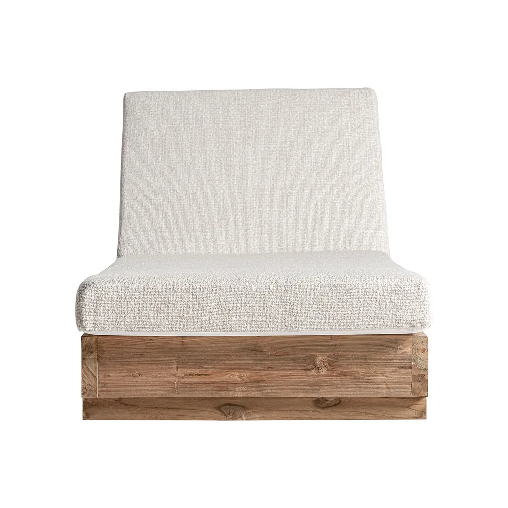 Tumbona pure de estilo colonial fabricado en madera de teka reciclada en color marrón combinado con polipropileno reciclado en color blanco. Producto desmontable plegable desenfundable.