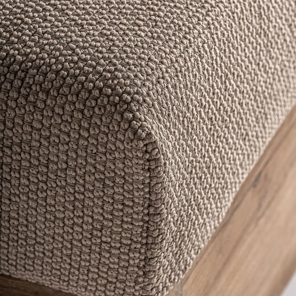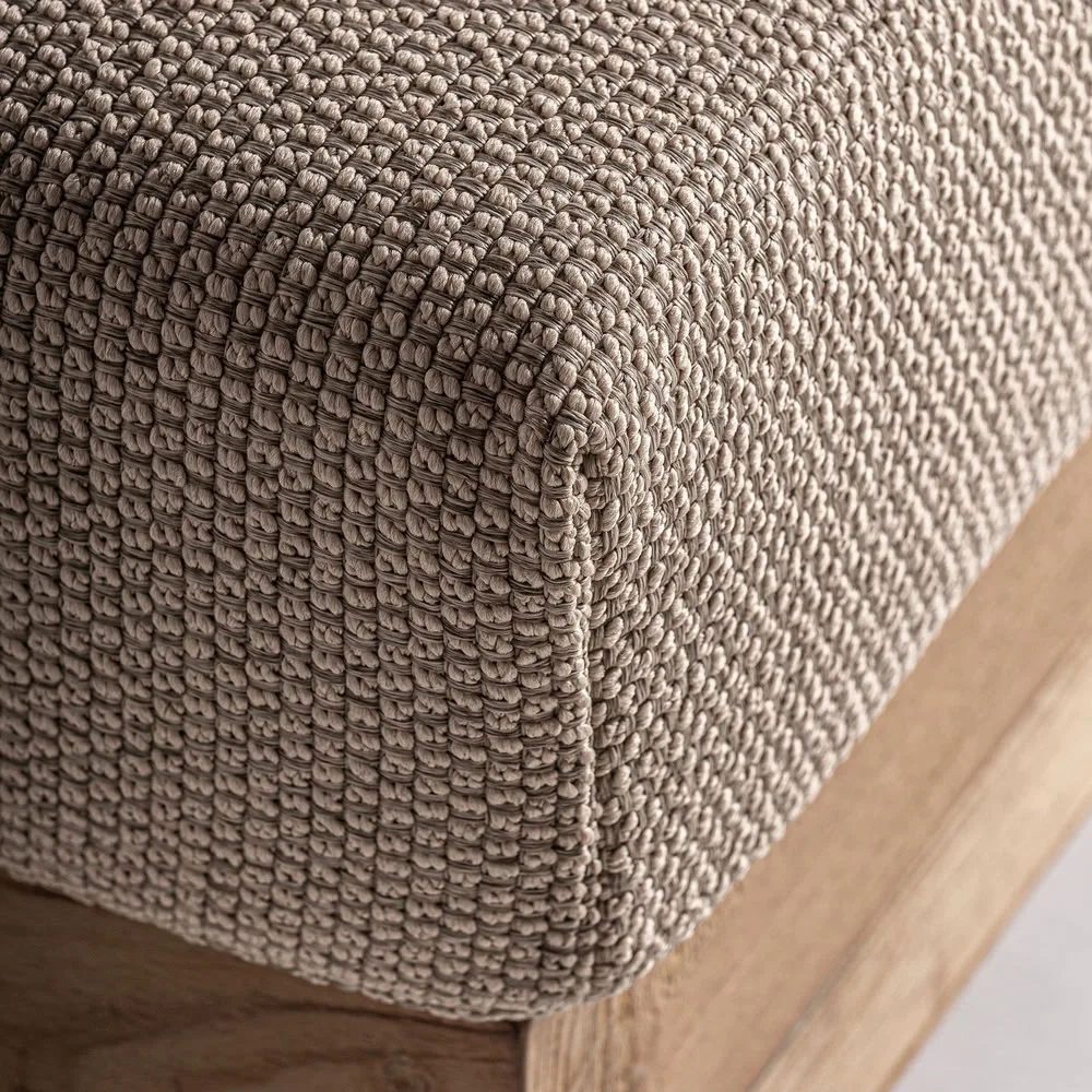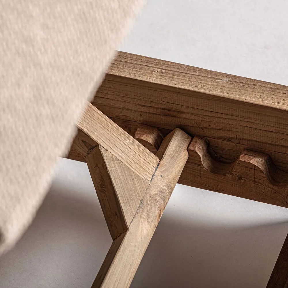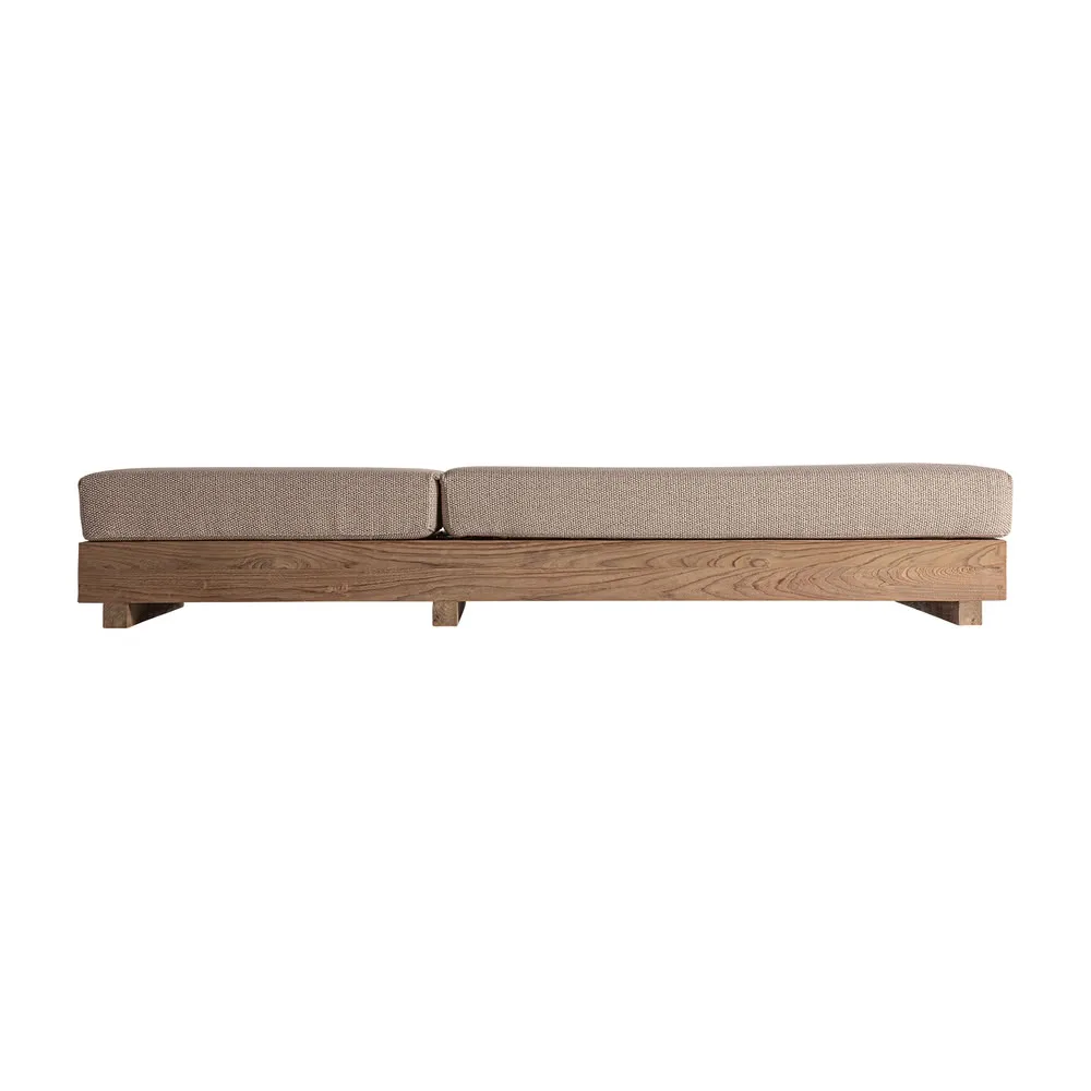 Tumbona pure de estilo colonial fabricado en madera de teka reciclada en color marrón con acabado natural combinado con polipropileno reciclado en color beige y espuma. Producto desmontable plegable desenfundable.
