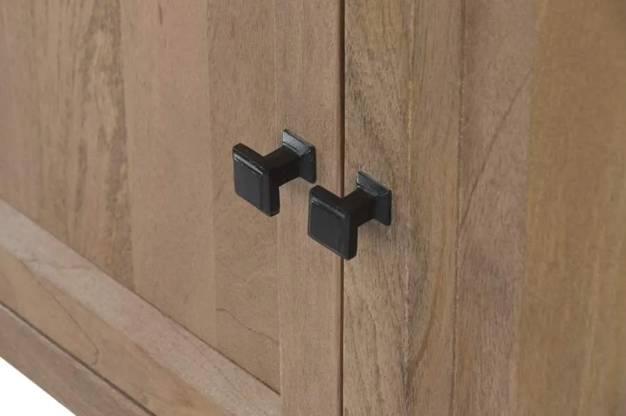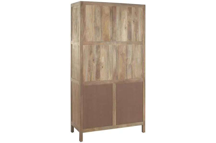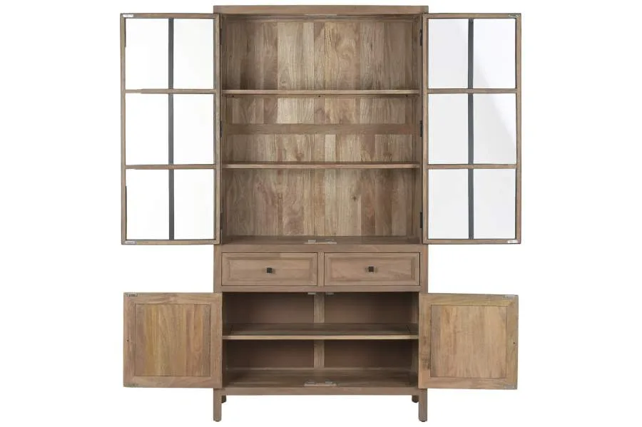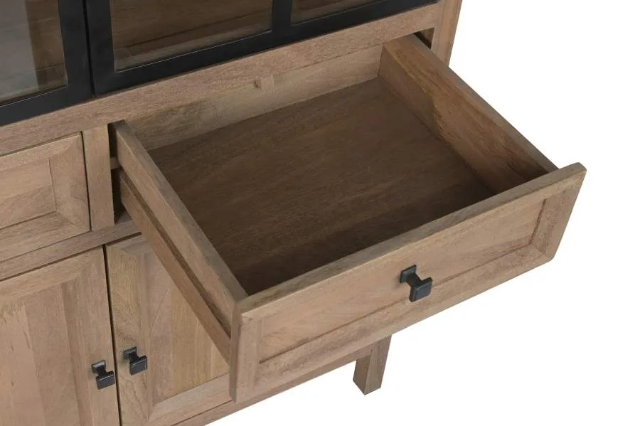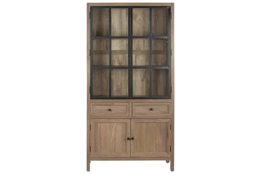Vitrina de gran formato con estructura de madera de mango y detalles en metal negro. Su estética industrial y natural de inspiración loft la convierte en una pieza imponente para salones y estudios. Cuenta con puertas, cajones y estantes para una organización versátil y elegante. Dimensiones: 100X42X195