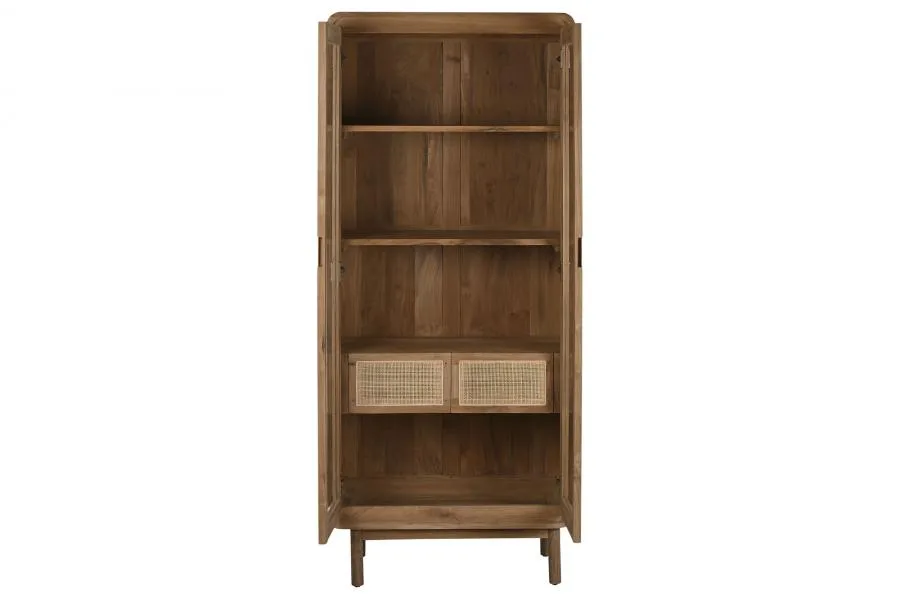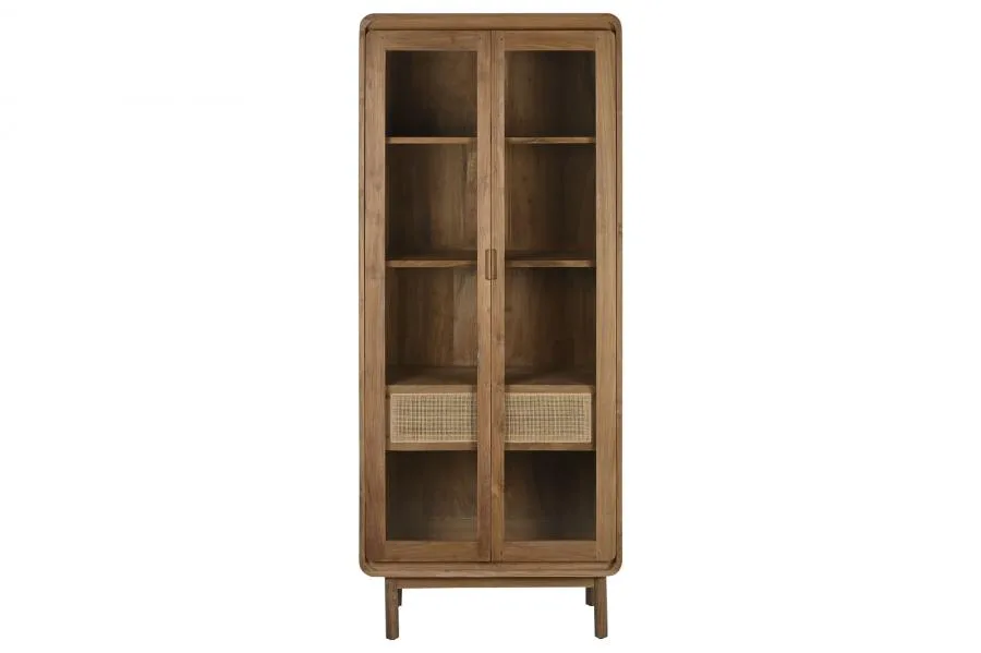 Vitrina de teca maciza en color natural con puertas de cristal, cajones y estantes interiores. Sus puertas acristaladas permiten exhibir vajillas, libros y objetos decorativos sin perder de vista su contenido, mientras los cajones inferiores ofrecen almacenamiento discreto. Una pieza esbelta y elegante para salones y comedores que buscan una vitrina de teca y cristal de madera maciza con calidez tropical. Mide 80 cm de ancho, 45 cm de fondo y 190 cm de alto.